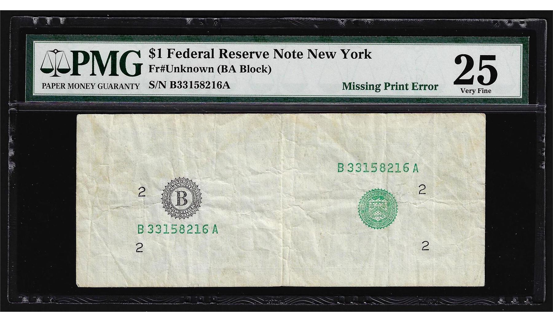 $1 Federal Reserve Note ERROR Missing Second Print PMG Very Fine 25