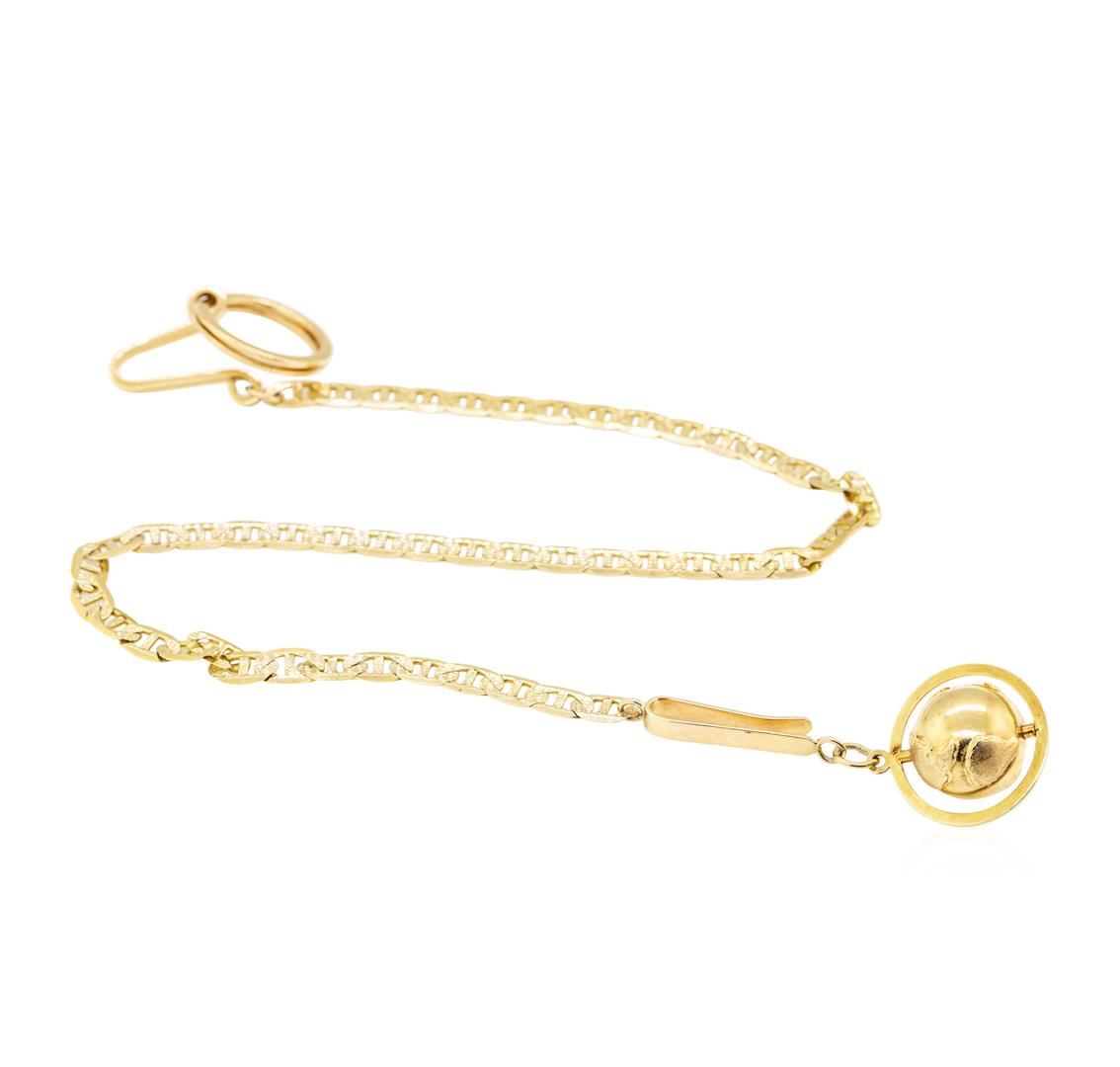One watch fob measuring eighteen and a half inches in length with an attached gold globe featuring: 10KT and 14KT yellow gold weighing a total of 34.5 grams.