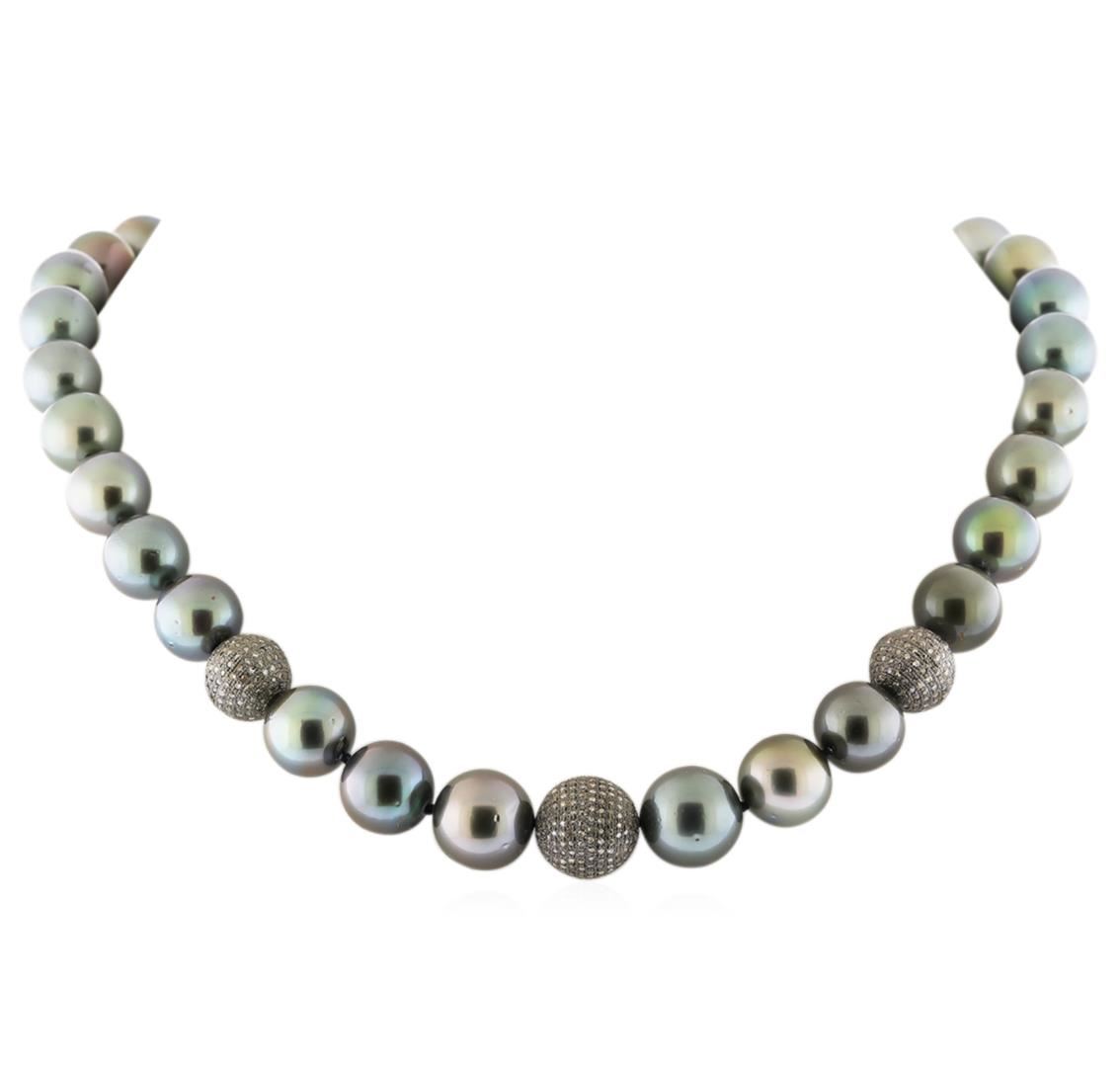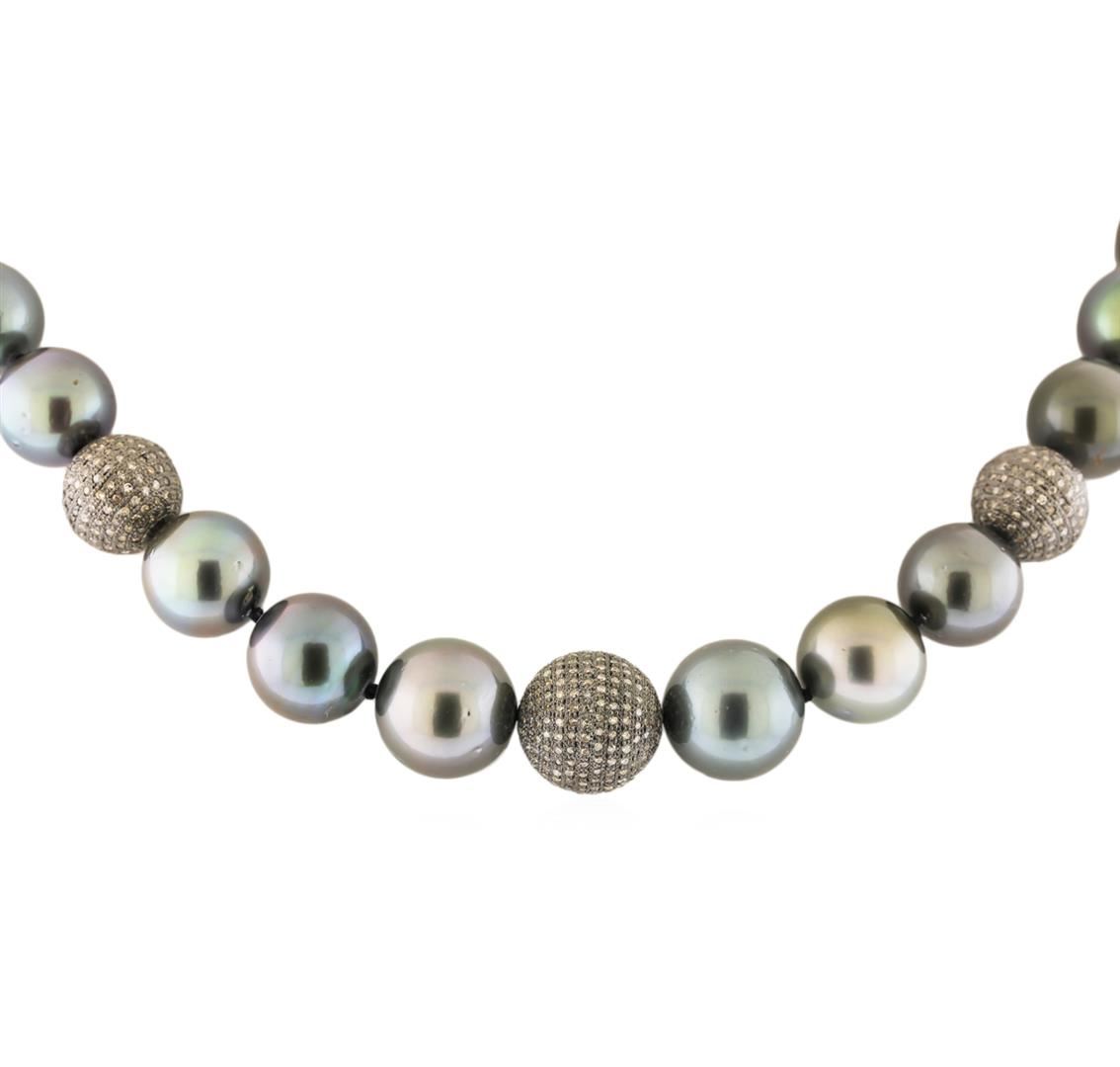 One graduated single strand pearl necklace 18.5" princess length, knotted with a silver 13.5mm ball magnetic clasp containing 32 Tahitian pearls, 10.5mm in size to 14.0mm in size. The pearls are black in color with a very good luster, round to near round, lightly blemished Graded in the strand.Tahitian cultured pearls form in the large "Black Lipped" Pinctada Margaritifera oyster, which is about twice the size of the Japanese Akoya oyster. This warm water species from across the central and South Pacific Ocean is at home in the bays and lagoons of the islands & atolls of French Polynesia. Tahitian cultured pearl farmers generally raise their oysters in lagoons.Tahitian cultured pearls take from two to four years to form. Black pearls are known for their iridescent, vibrant, almost metallic natural colors, unique among saltwater cultured pearls. Though commonly called "Tahitian" pearls, they are actually gray, to a lighter or darker degree. Tahitian pearls have the unique ability to display a variety of colors at the same time, which can be seen glistening on their surface. Seven Hundred Twenty-Six bead set single cut diamonds, measuring 1.00 - 0.80 x 0.54mm (depth est.) approximate total weight of 726 Stones = 1.90ct. Graded in the setting. Clarity: I-2 to I-3. Color: I - K. Total Weight of Diamonds 1.90ctw. AIG Appraised at $18,675.00.