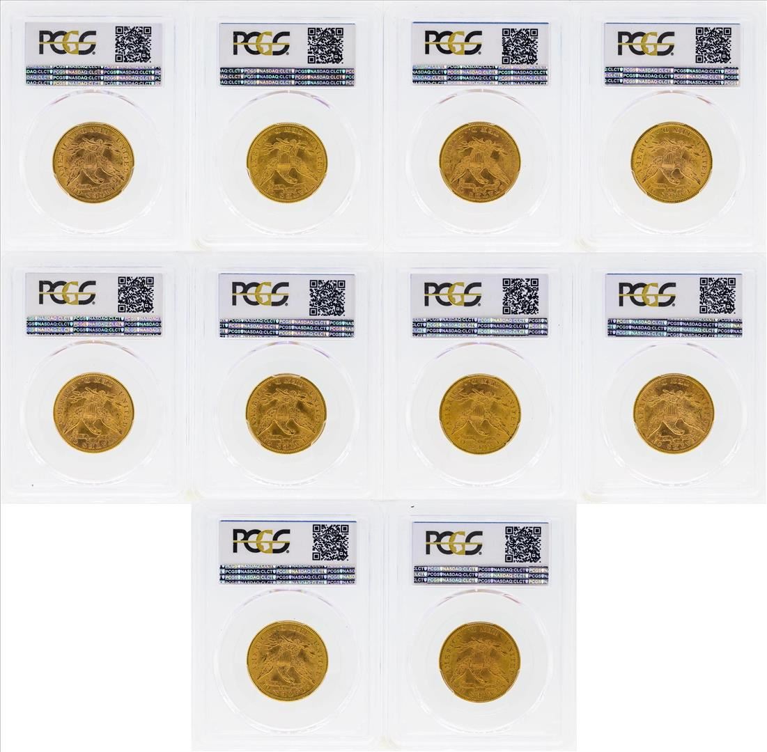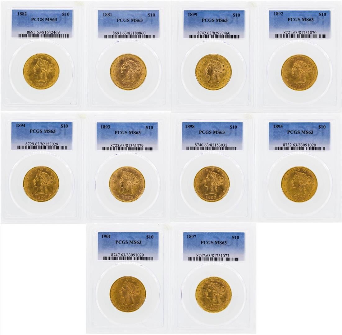 One (10) Assorted Years $10 Liberty Head Eagle Gold Coins PCGS63. PCGS Graded.