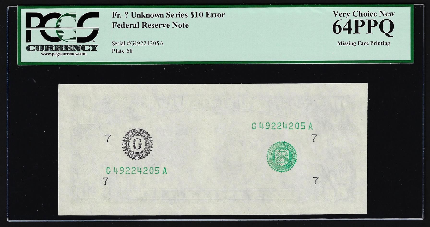 One $10 Federal Reserve Note Missing Face Print ERROR PCGS Very Choice New 64PPQ. PCGS Graded.