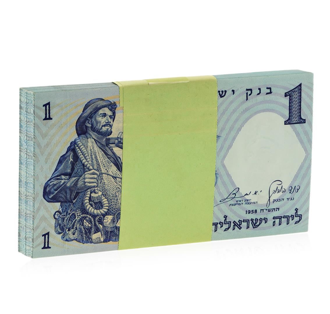 One pack of (100) Original 1958 Bank of Israel 1 Lira Notes Uncirculated.