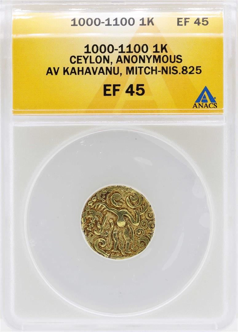 One 1000-1100 Ceylon Kahavanu Gold Coin ANACS XF45. ANACS Certified.