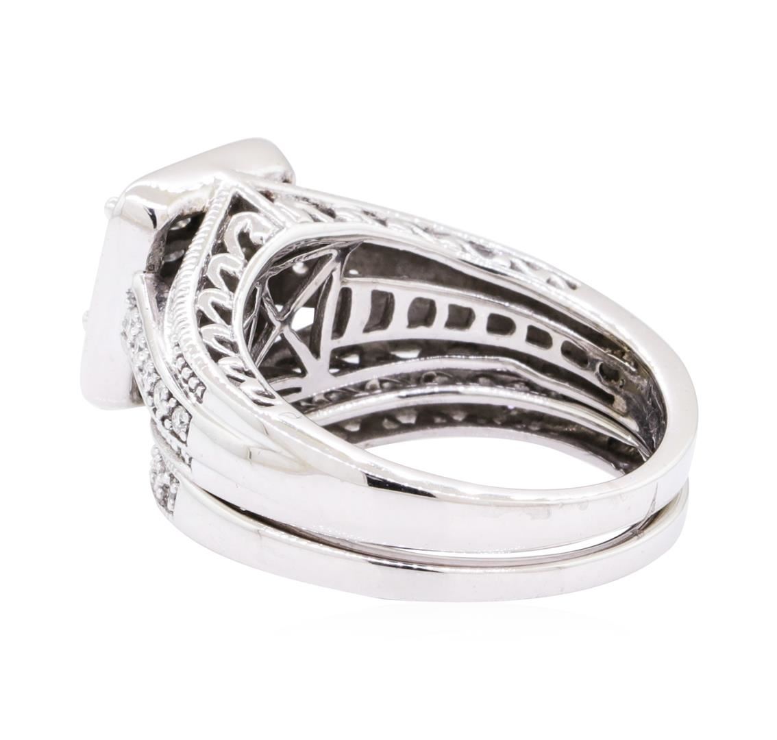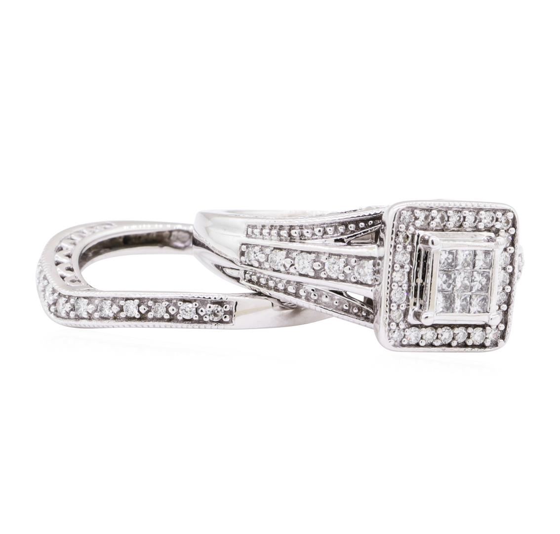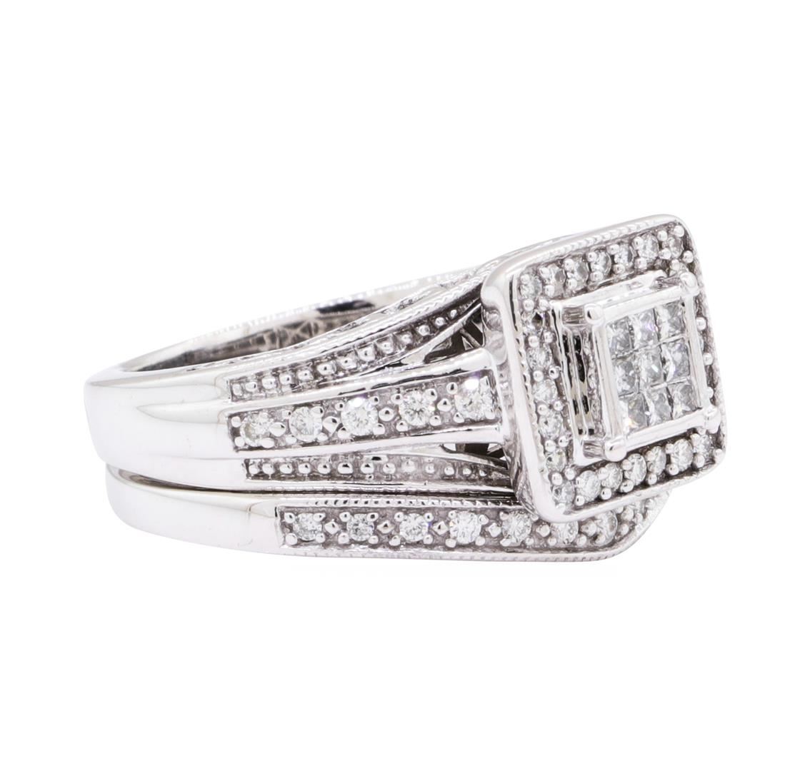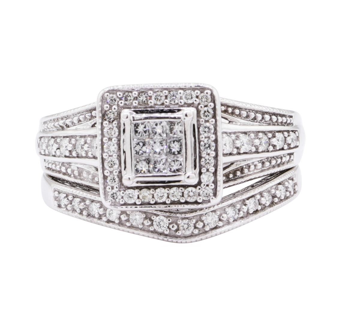 One square halo wedding set featuring: 10KT white gold weighing 5.8 grams containing diamonds weighing 0.50ctw. The rings are size 5.5.