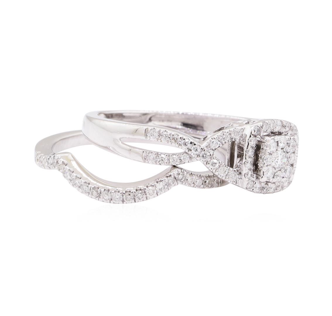One crossover halo wedding set featuring: 10KT white gold weighing 4.5 grams containing diamonds weighing 0.60ctw. The rings are size 7.