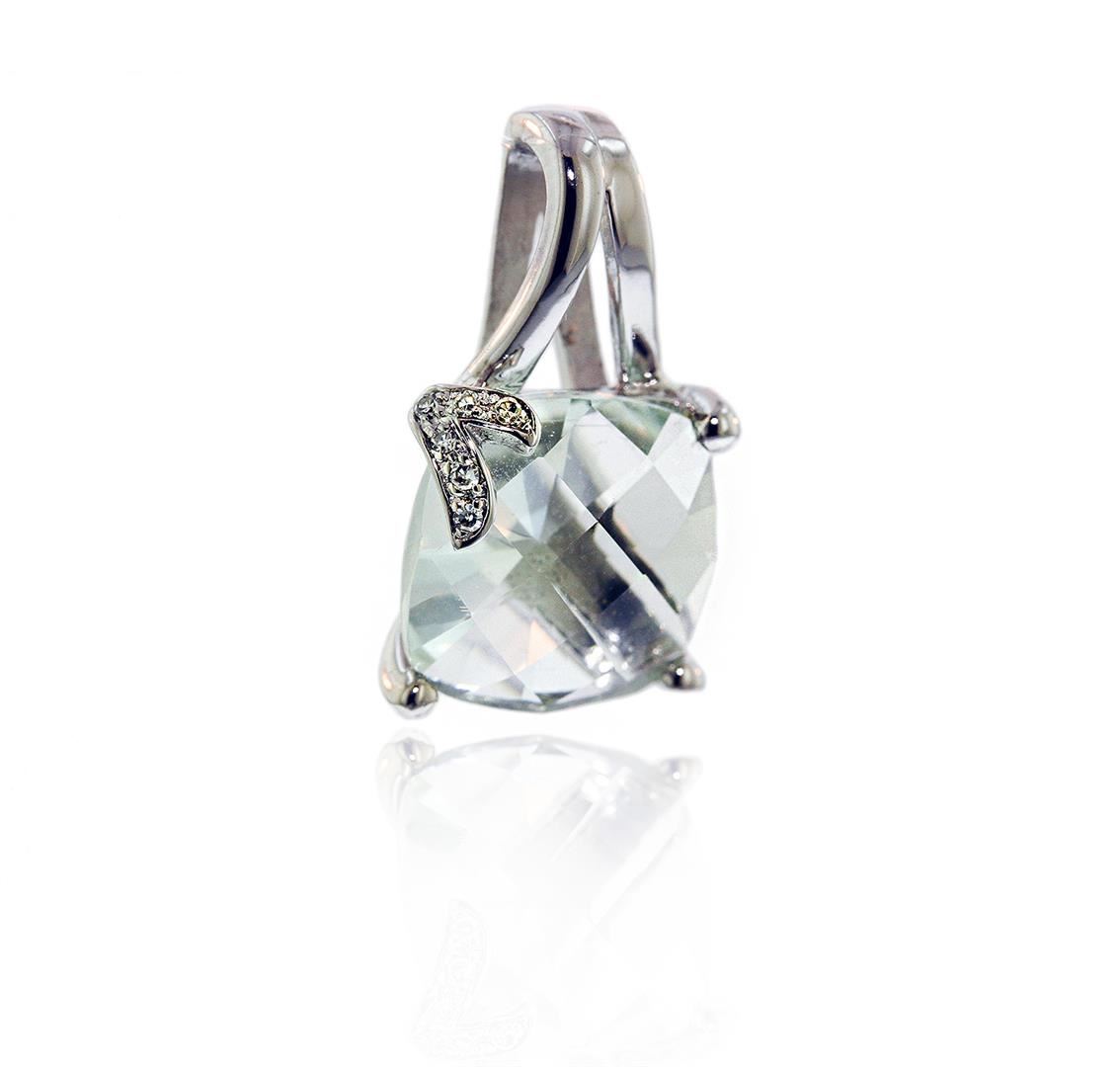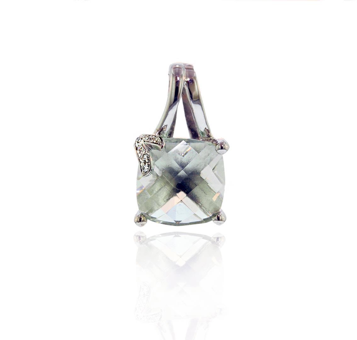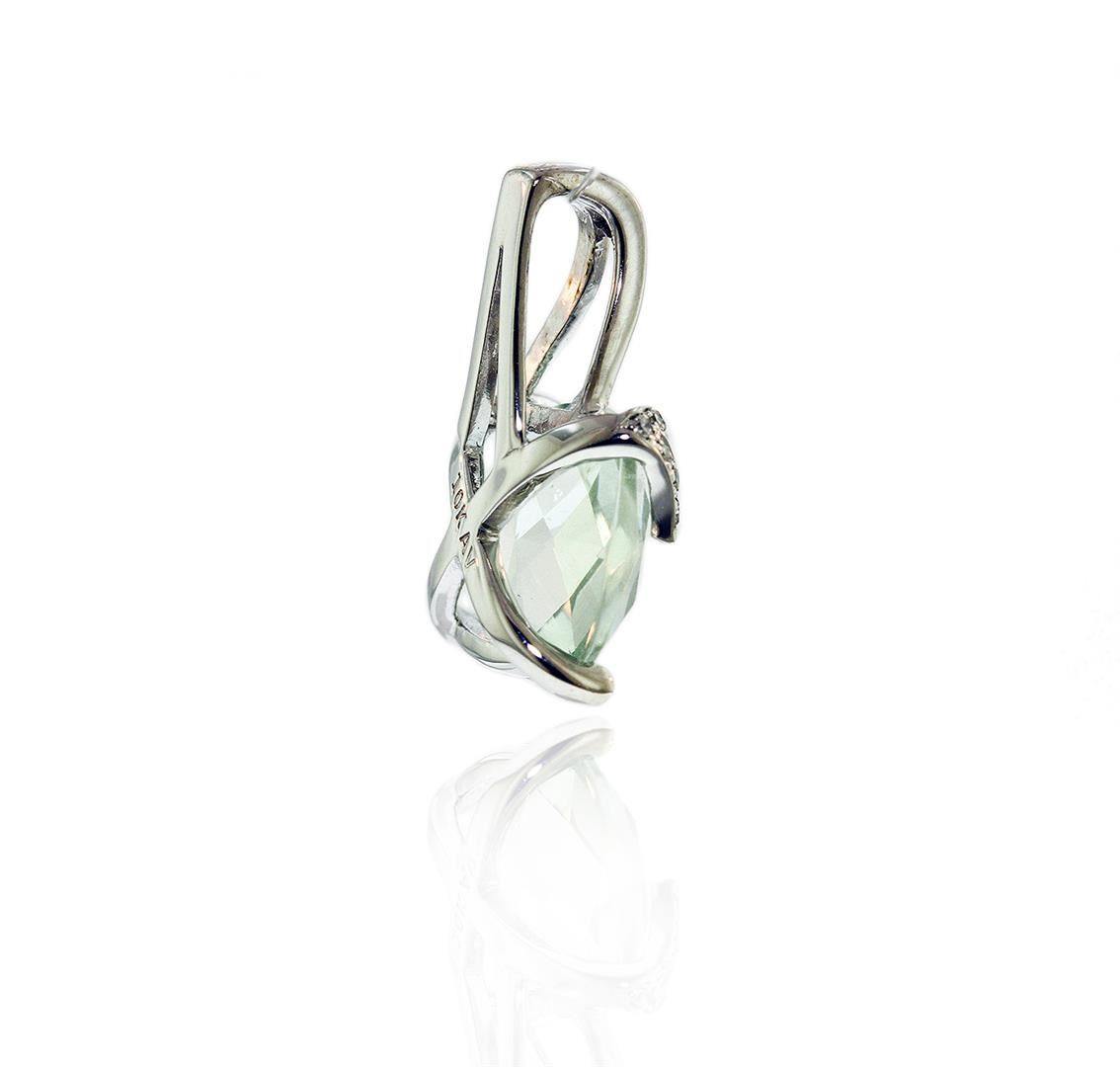 One 10KT White Gold 5ct Smokey Quartz and Diamond Pendant. Total Weight of item is 10KT White Gold is 1.9 grams.