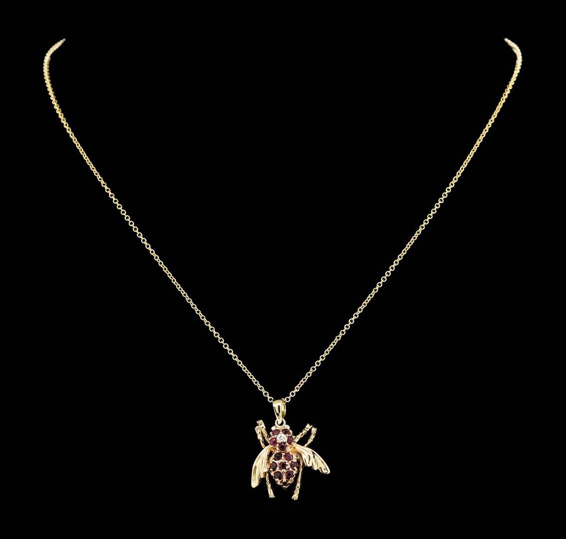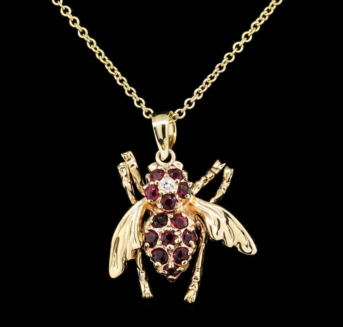 One 10KT Yellow Gold 0.60ctw Ruby and Diamond Fly Pendant with Chain. Total weight of rubies is 0.60cts. Total weight of diamonds is 0.02cts. Total weight of pedant with chain is 4.00 grams.