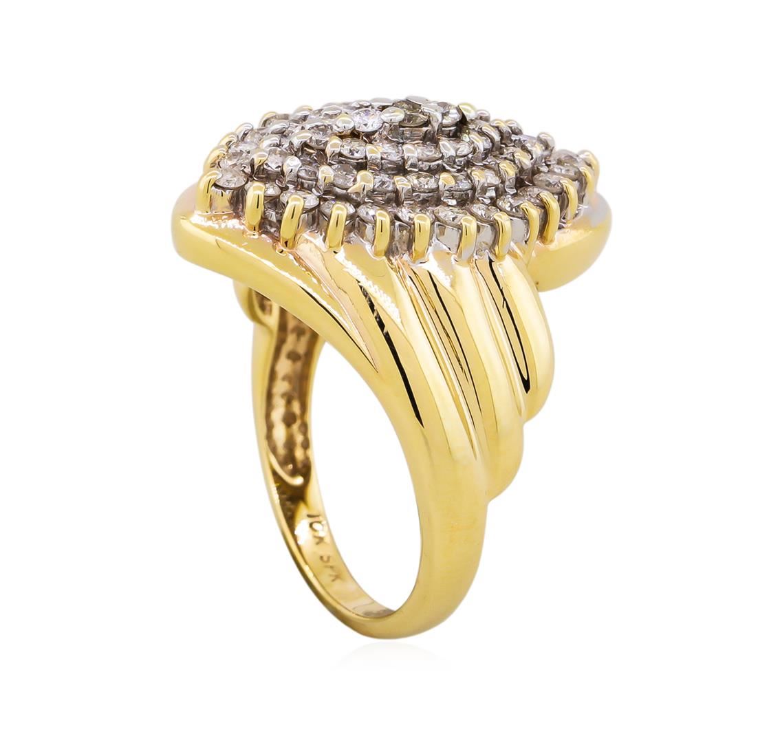 This ring is made of 10KT Yellow Gold weighing approximately 6.50 grams with markings of "10K" on the inside of the band. There is approximately 1ctw of round cut diamonds. The ring is a size 7.