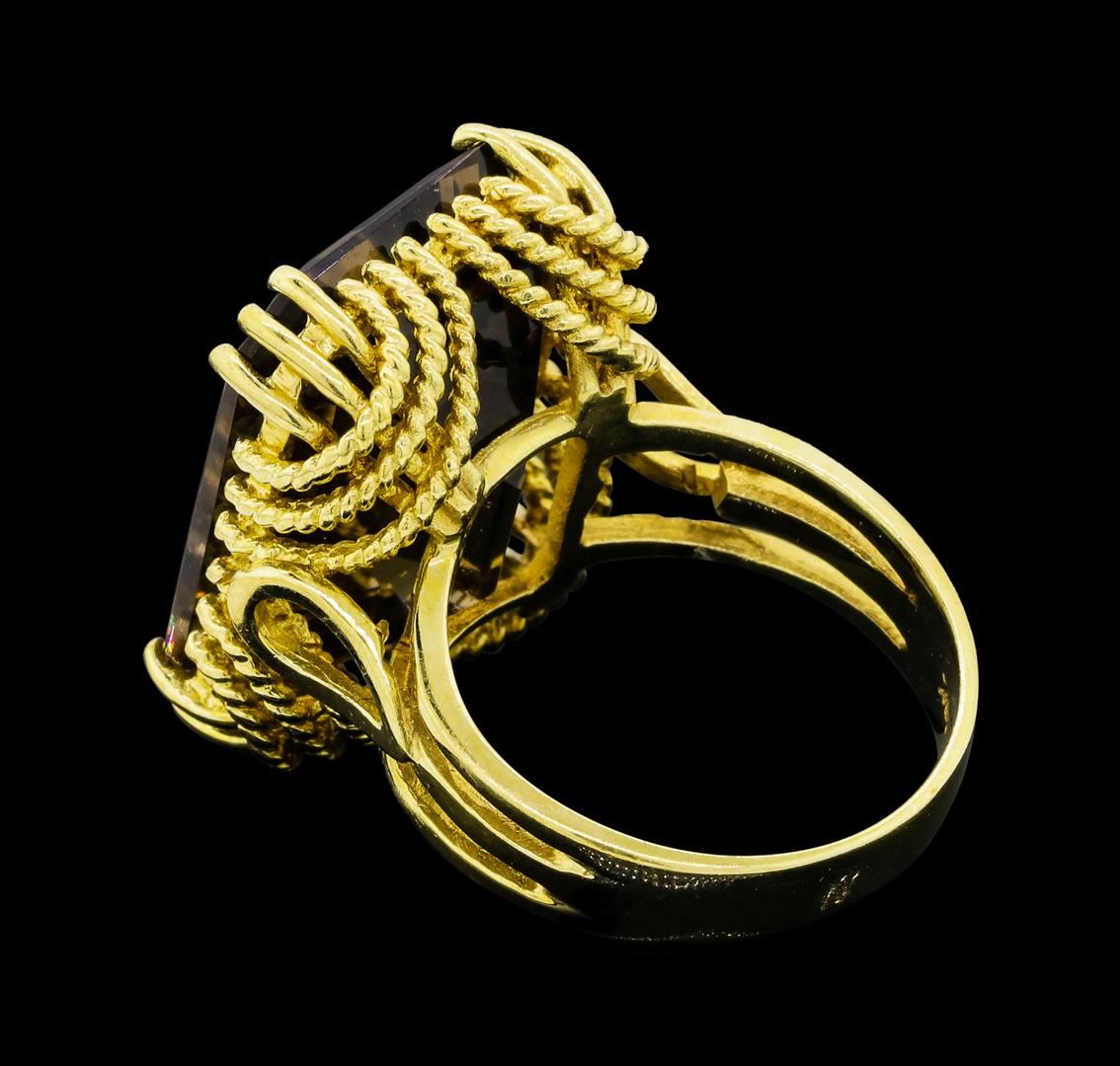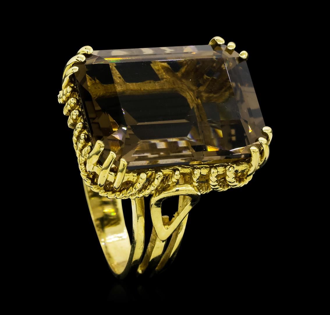 One lady's ring featuring: 10KT yellow gold weighing 10.2 grams containing one emerald cut smoky quartz weighing 21.00ctw. The ring is a size 8.