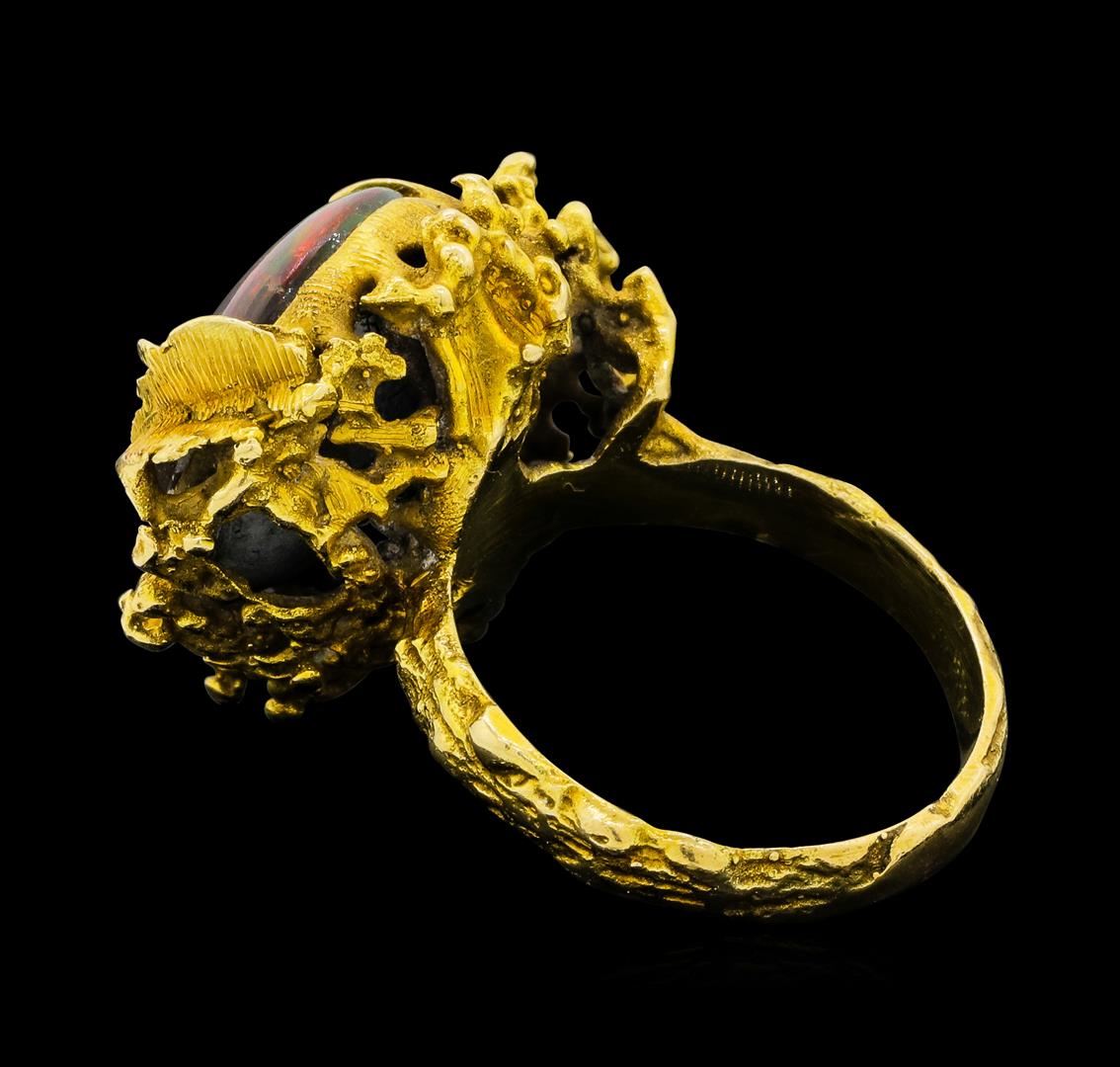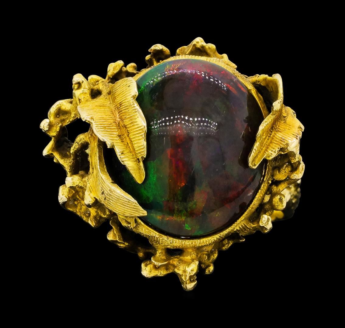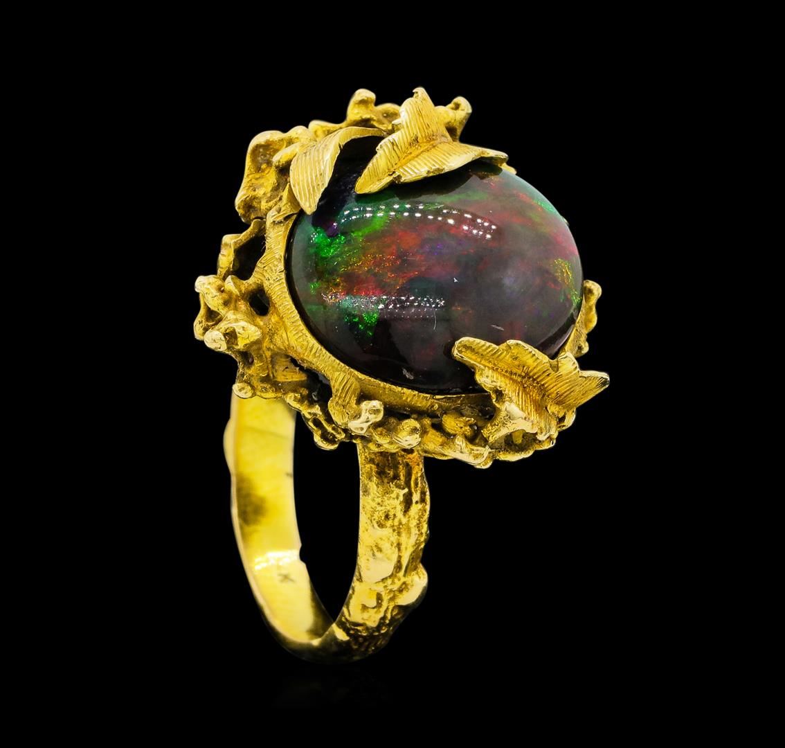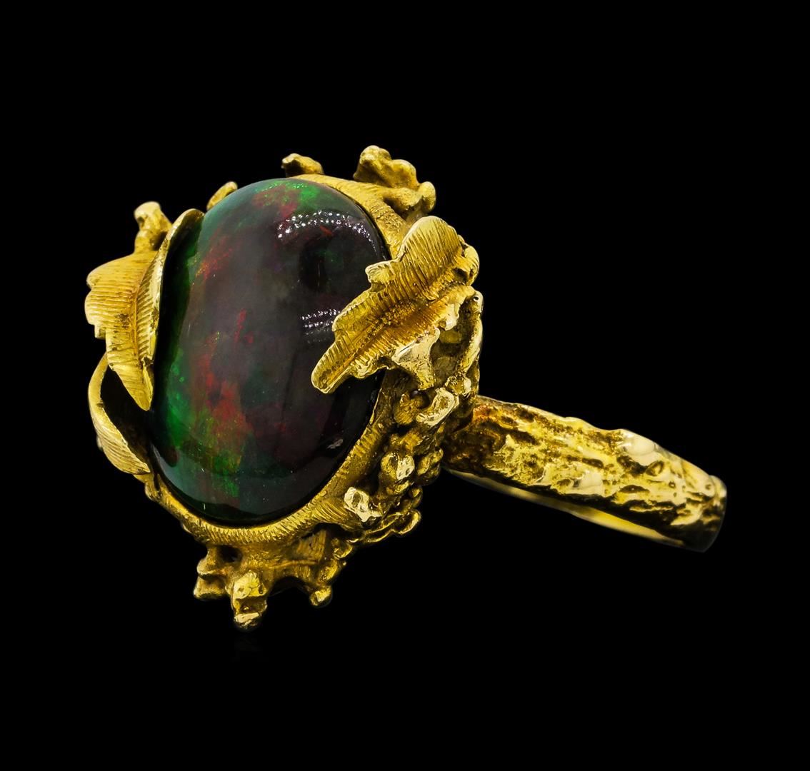 One lady's ring featuring: 10KT yellow gold weighing 8.8 grams containing one oval cabochon cut black opal doublet. The ring is a size 6.5.