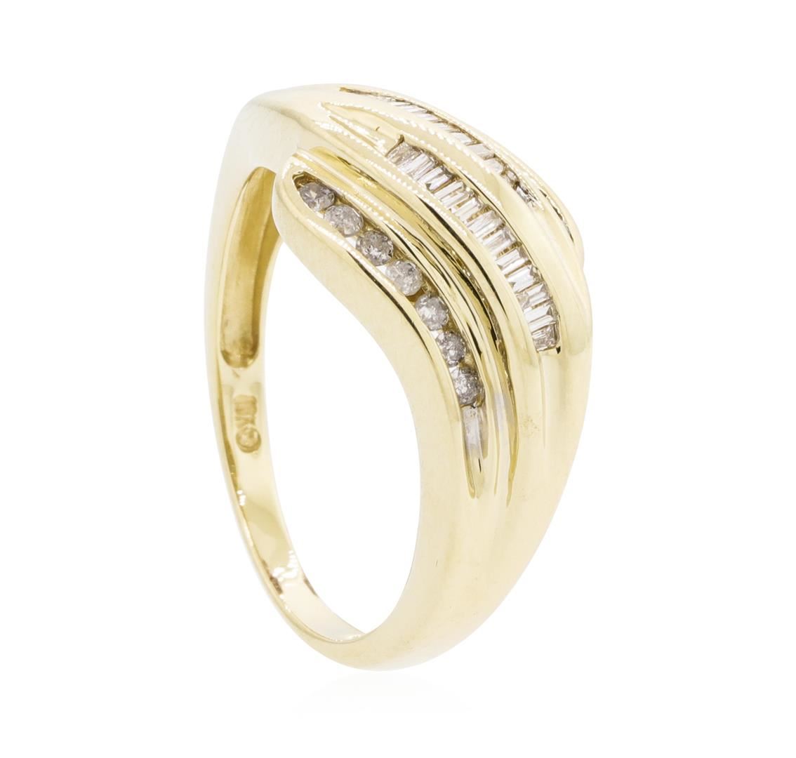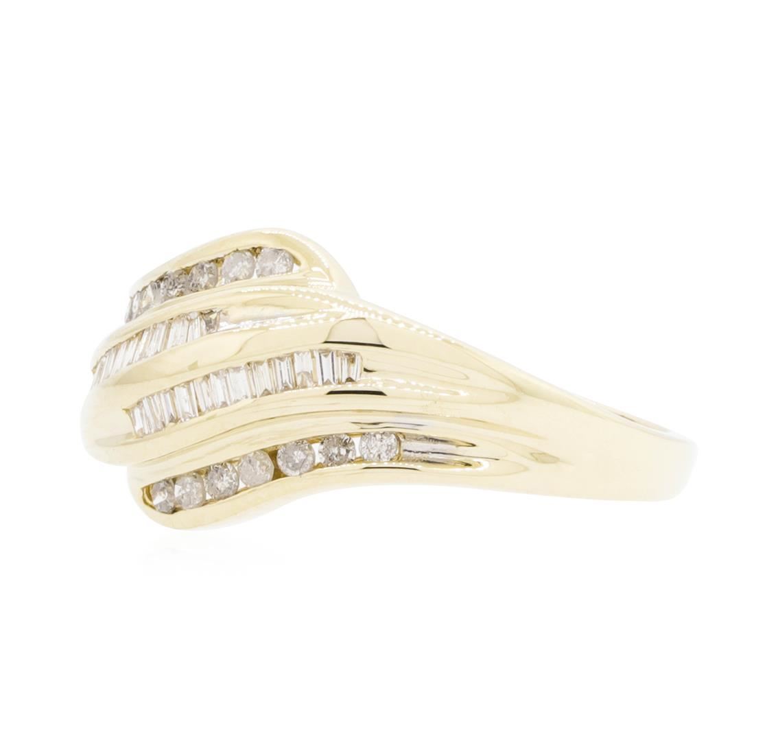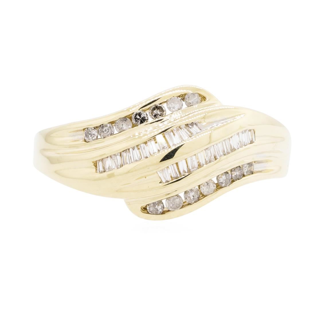 One lady's ring featuring: 10KT yellow gold weighing 3.5 grams containing diamonds weighing 0.50ctw. The ring is a size 7.25.