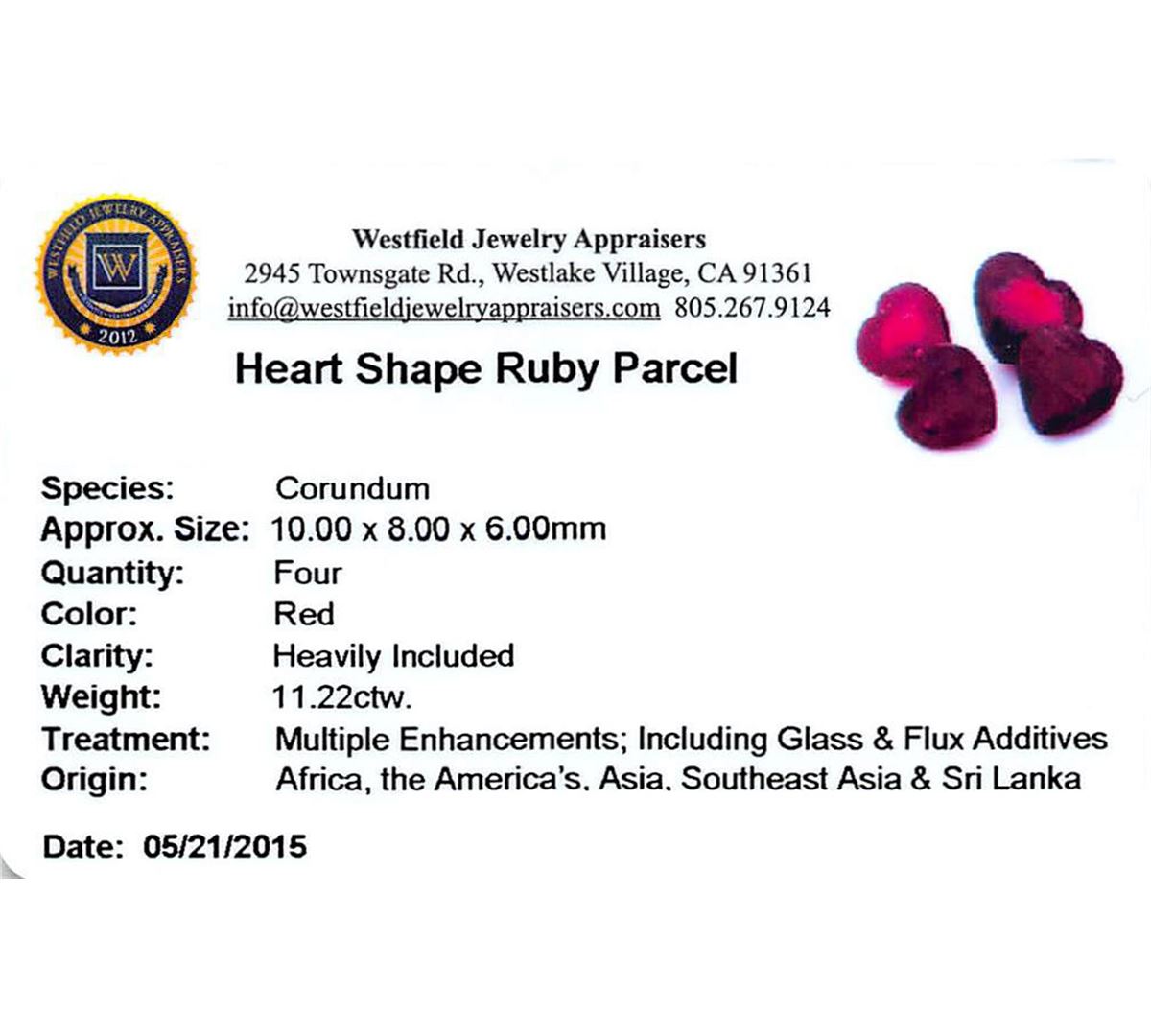 Four heart mixed cut natural rubies, measuring 10.00 x 8.00 x 6.00mm, exact total weight 11.22ct., clarity is heavily included, type II, dark, very slightly brownish, red color, (GIA R 7/3), cut is good. Measurements are an average for the group. Transmitting light somewhat diffusely, transparent to translucent. Naturally occurring internal & external characteristics are present. Indications of laboratory high temperature heat treatment, with glass & flux additives. Ruby has a low tolerance to rhodium plating, repolishing the surface, & ultrasonic cleaning. UGS Appraised.