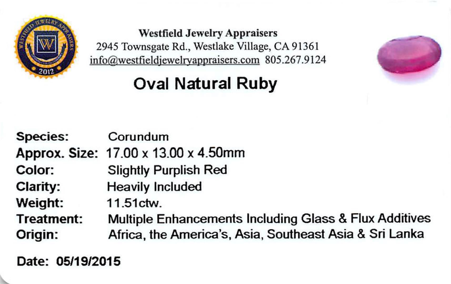 One oval mixed cut natural ruby, measuring 17.00 x 13.00 x 4.50mm, exact weight 11.51ct., clarity is heavily included, type II, medium dark, very slightly brownish, slightly purplish red color, (GIA slpR 6/3), cut is good. Transmitting light somewhat diffusely, transparent to translucent. Naturally occurring internal & external characteristics are present. Indications of laboratory high temperature heat treatment, with glass & flux additives. Ruby has a low tolerance to rhodium plating, repolishing the surface, & ultrasonic cleaning. UGS Appraised.