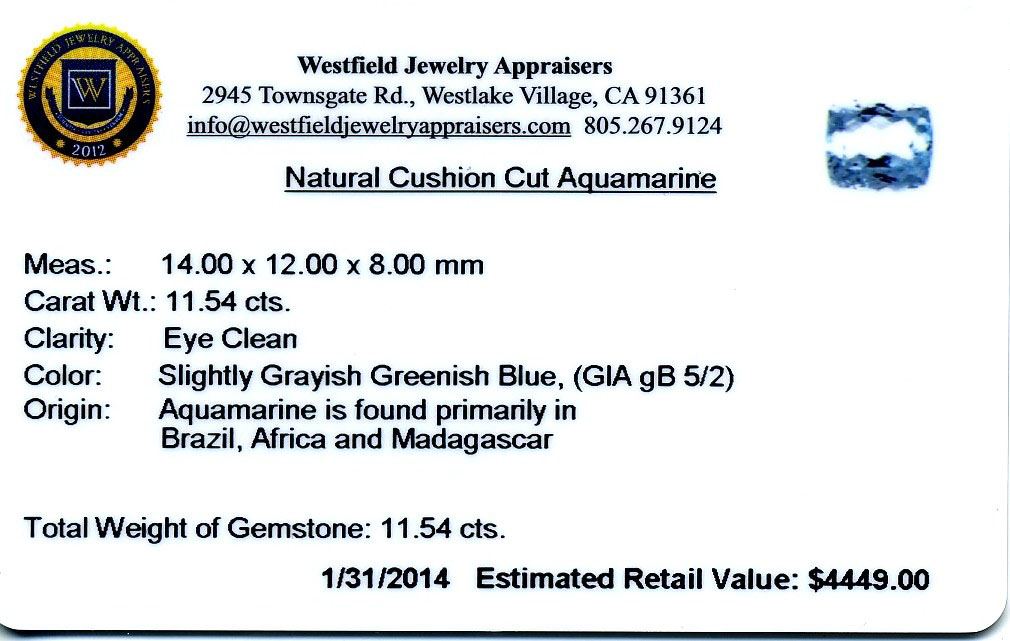11.54ct. Natural Cushion Cut Aquamarine UGS Appraised at $4,449.00.