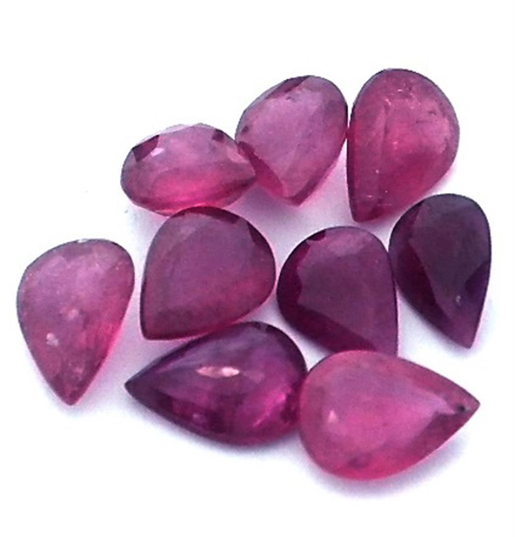 Ten pear mixed cut natural rubies, measuring 7.80 x 5.70 x 2.50mm, exact total weight 11.99ct., clarity is heavily included, type II, dark, very slightly brownish, slightly purplish red color, (GIA slpR 7/3), cut is good. Measurements are an average for the group. Transmitting light somewhat diffusely, transparent to translucent. Naturally occurring internal & external characteristics are present. Indications of laboratory high temperature heat treatment, with glass & flux additives. Ruby has a low tolerance to rhodium plating, repolishing the surface, & ultrasonic cleaning. UGS Appraised at $1,440.00.