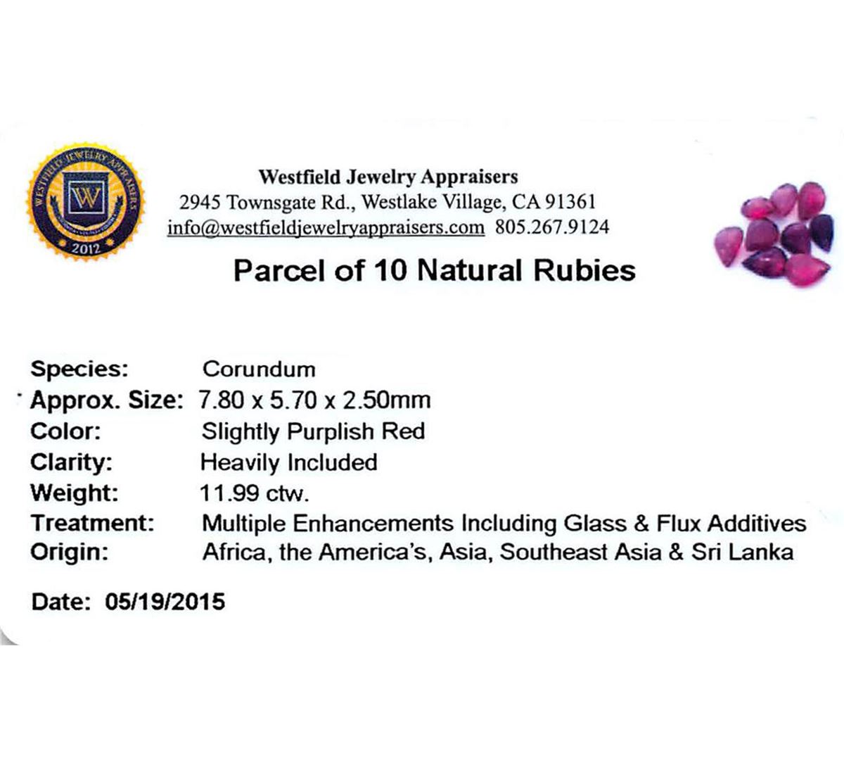 Ten pear mixed cut natural rubies, measuring 7.80 x 5.70 x 2.50mm, exact total weight 11.99ct., clarity is heavily included, type II, dark, very slightly brownish, slightly purplish red color, (GIA slpR 7/3), cut is good. Measurements are an average for the group. Transmitting light somewhat diffusely, transparent to translucent. Naturally occurring internal & external characteristics are present. Indications of laboratory high temperature heat treatment, with glass & flux additives. Ruby has a low tolerance to rhodium plating, repolishing the surface, & ultrasonic cleaning. UGS Appraised.