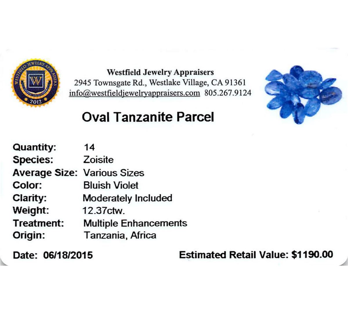 Fourteen oval mixed cut natural tanzanites exact total weight 12.37ct., clarity is moderately included, type I, medium dark, very slightly grayish, bluish violet color, (GIA bV 6/3), cut is good. Transmitting light with a minimum of distortion, transparent. Naturally occurring internal & external characteristics are present. Color grade is an average for the group. Tanzanite is a very rare gemstone that is only found in the country of Tanzania. Originally discovered in 1967. Tiffany & Company, named the stone Tanzanite. It is found in the Usumburu Mountains that border the Umba Valley of northern Tanzania. Tanzanite occurs in gray, brown, violet, blue, reddish-purple, & green. The gem is interesting because of its exceptional pleochroism. Rotated in different directions a tanzanite will exhibit multiple changes of color. Tanzanite has a low tolerance to ultrasonic cleaning, and should not be cleaned using this method. UGS Appraised at $1,190.00.