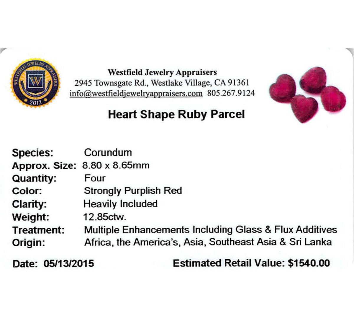 Four heart mixed cut natural rubies, measuring 8.80 x 8.65 x 3.50mm, exact total weight 12.85ct., clarity is heavily included, type II, dark, very slightly brownish, strongly purplish red color, (GIA stpR 7/3), cut is good. Measurements are an average for the group. Transmitting light somewhat diffusely, transparent to translucent. Naturally occurring internal & external characteristics are present. Indications of laboratory high temperature heat treatment, with glass & flux additives. Ruby has a low tolerance to rhodium plating, repolishing the surface, & ultrasonic cleaning. UGS Appraised at $1,540.00.