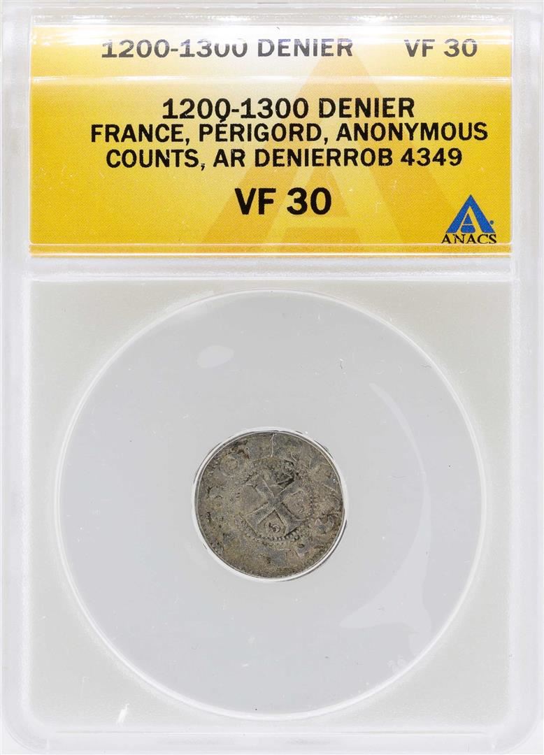 One 1200-1300 France Denier Perigord Coin ANACS VF30. ANACS Certified.