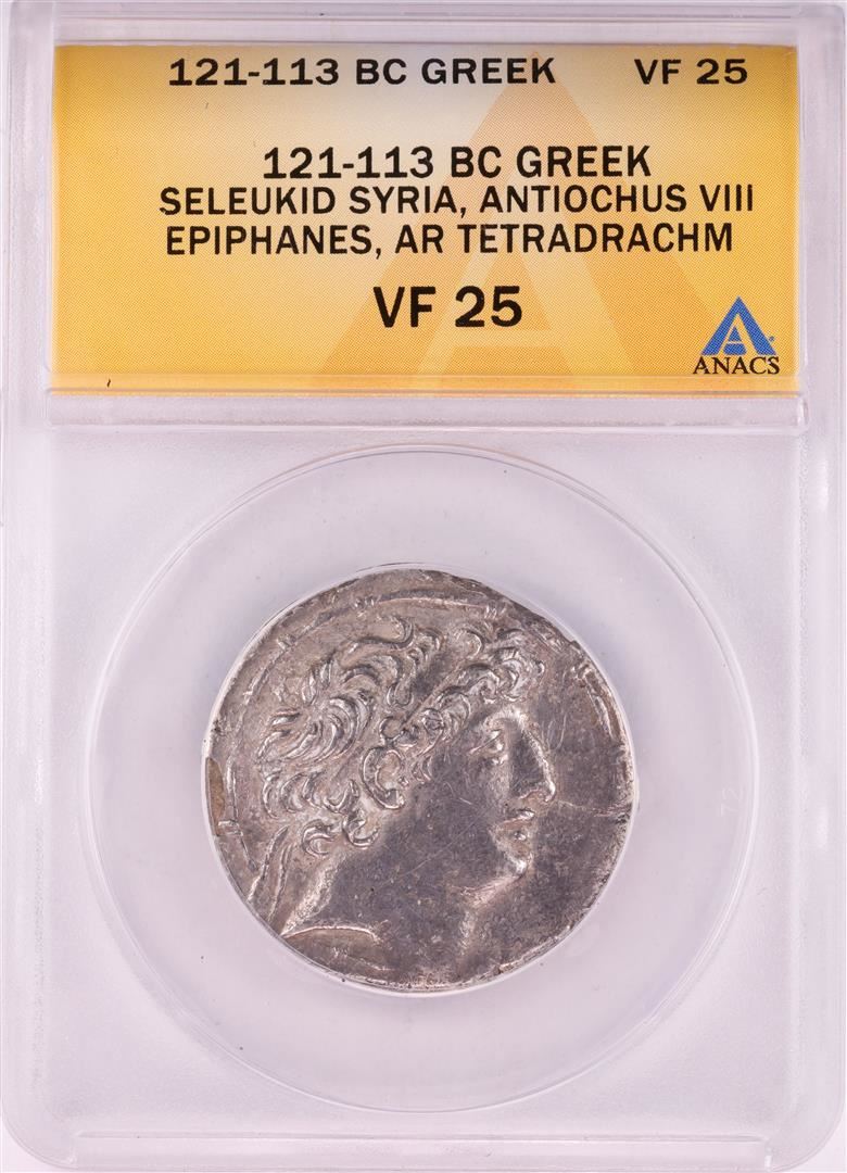 One 121-113 BC Ancient Greek Seleukid Syria Antiochus VIII Epiphanes Tetradrachm ANACS VF25. ANACS Certified.