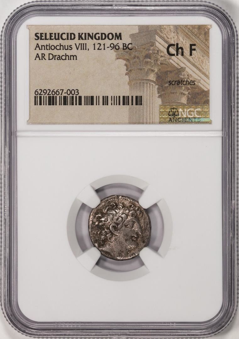 One 121-96 BC Seleucid Kingdom Antiochus VIII AR Drachm Ancient Coin NGC Ch F. NGC Certified.