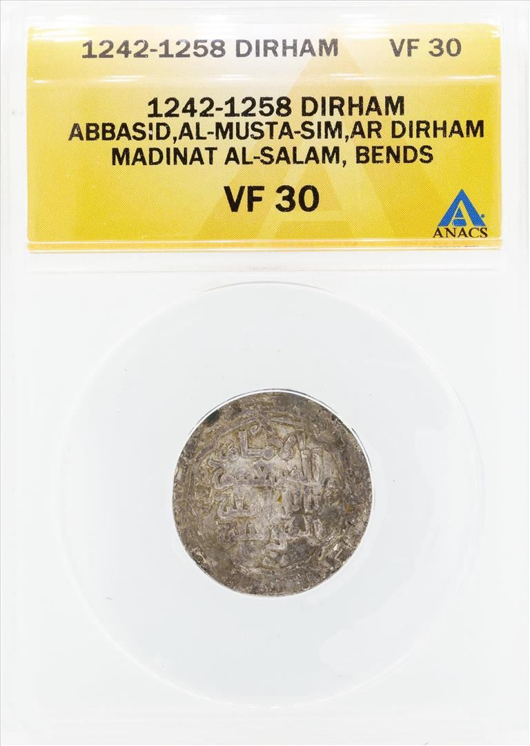 One 1242-1258 Dirham Abbasid Al Musta Sim AR Madinat AL Salam Bends Coin ANACS VF30. ANACS Certified.