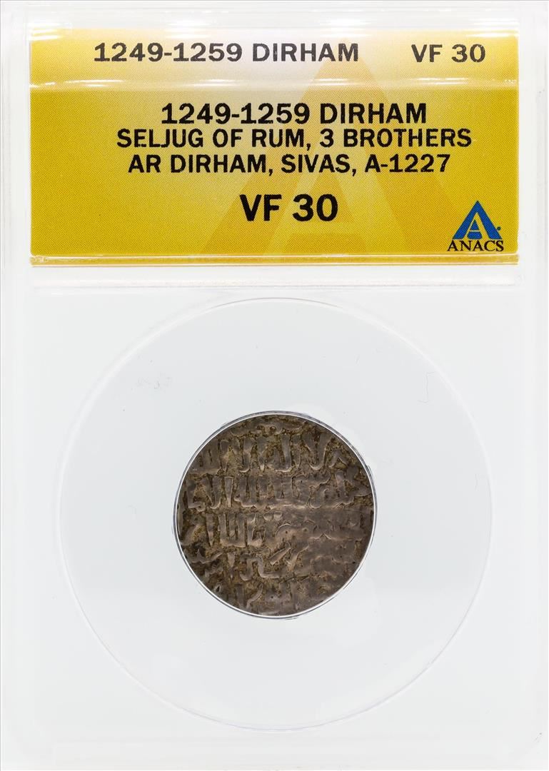 One 1249-1259 Dirham Seljug of Rum 3 Brothers Coin ANACS VF30. ANACS Certified.
