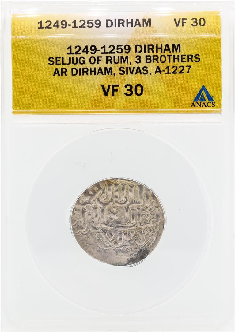One 1249-1259 Dirham Seljug of Rum 3 Brothers Coin ANACS VF30. ANACS Certified.