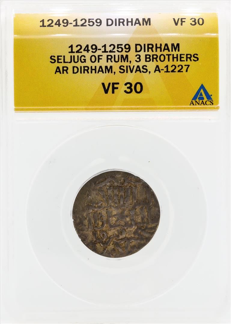 One 1249-1259 Dirham Seljug of Rum 3 Brothers Coin ANACS VF30. ANACS Certified.