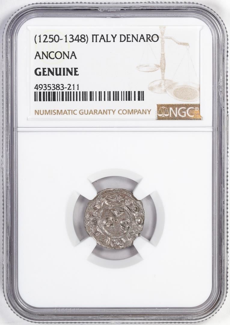 One 1250-1348 Italy Denaro Ancona Coin NGC Genuine. NGC Certified.