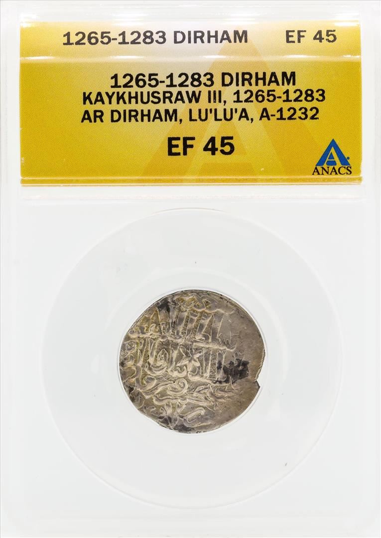 One 1265-1283 Dirham Kaykhusraw III Coin ANACS EF45. ANACS Certified.