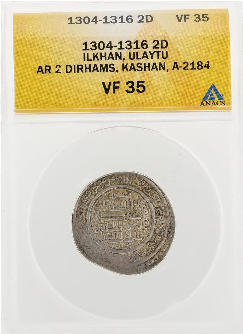 1304-1316 2D Ilkhan Ulaytu AR 2 Dirhams Kashan A-2184 Coin ANACS VF35