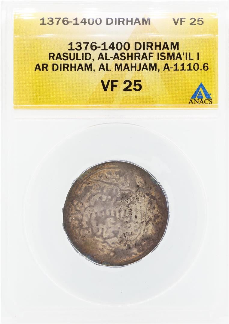 One 1376-1400 Dirham Rasulid Al Ashraf Isma IL I AL Mahjam Coin ANACS VF25. ANACS Certified.