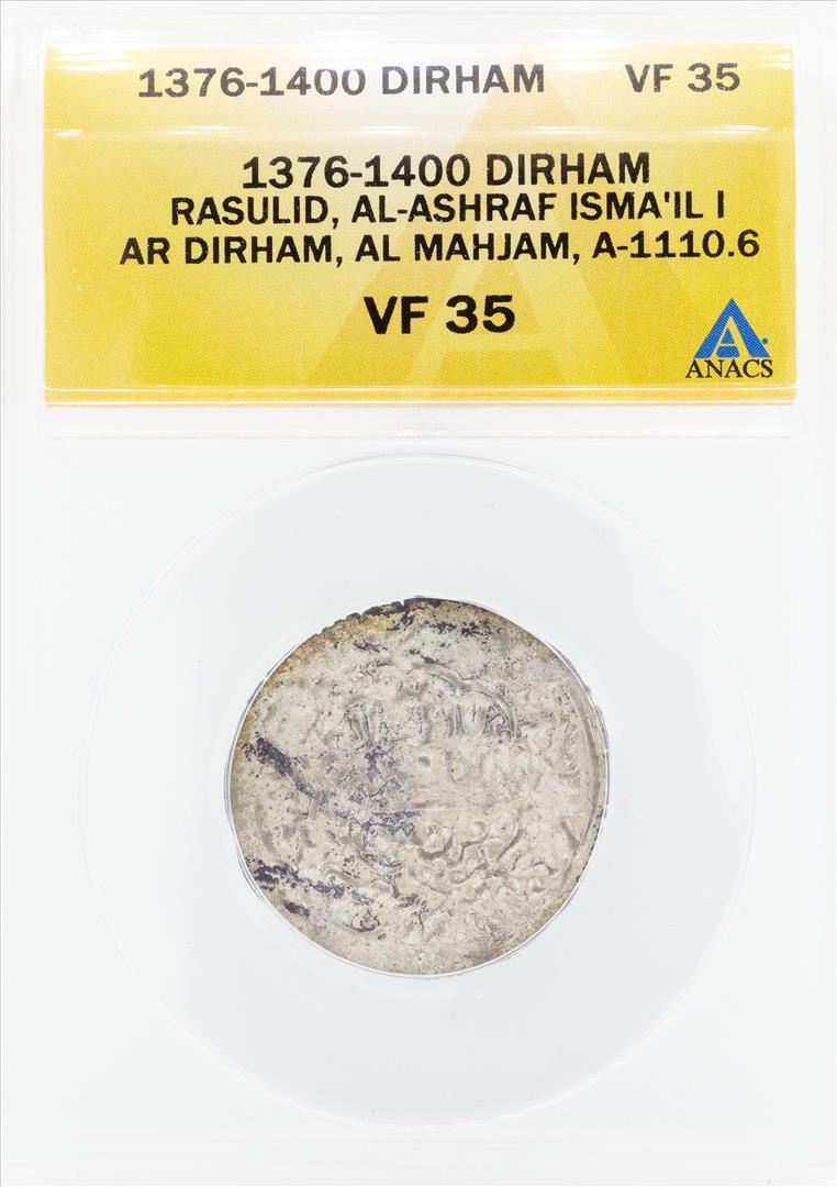 One 1376-1400 Dirham Rasulid Al Ashraf Isma IL I AL Mahjam Coin ANACS VF35. ANACS Certified.
