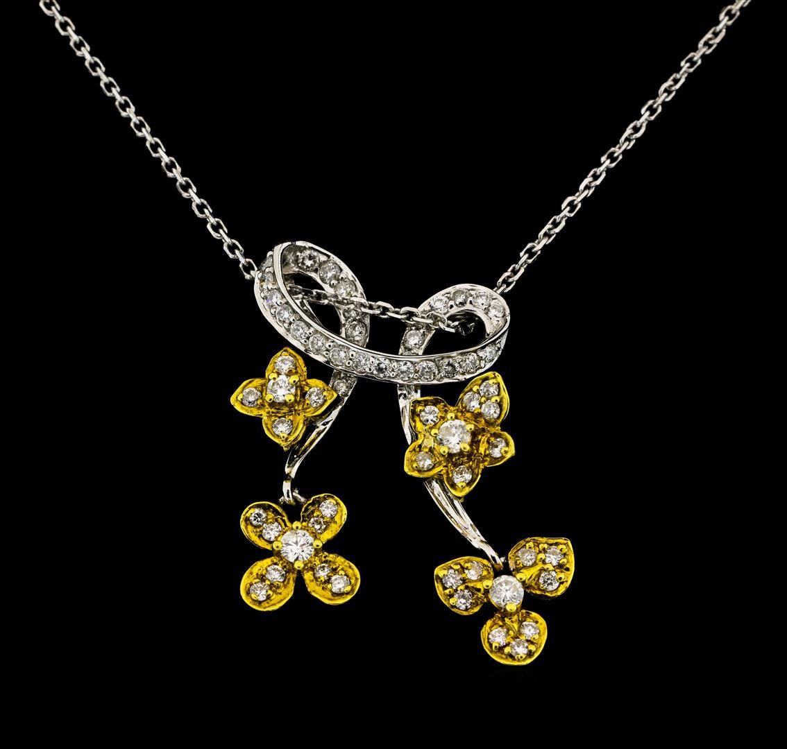 One electronically tested 14-18KT white and yellow gold lady's combination cast & assembled fashion floral design pendant & chain 16.0" long, 1mm diamond cut cable link with a spring ring clasp with a bright polish finish. The featured chain is cast in 14KT white gold and the pendant is cast in 18KT white and yellow gold. Identified with markings of "18K 750". Condition is new, good workmanship. Containing: Four prong set round brilliant cut diamonds, measuring 2.40 - 2.00 x 1.36mm (depth est.) approximate total weight of 4 Stones = 0.16ct. Graded in the setting. Clarity: SI-2 to I-1. Color: H - ICut Good Fifty-Five prong set round brilliant cut diamonds, measuring 1.40 - 1.30 x 0.84mm (depth est.) approximate total weight of 55 Stones = 0.52ct. Graded in the setting. Clarity: SI-1 to I-1. Color: H - ICut Good. Total Weight of Diamonds 0.68ct. Total Weight of Pendant & Chain 4.20gm. GAS Appraised.