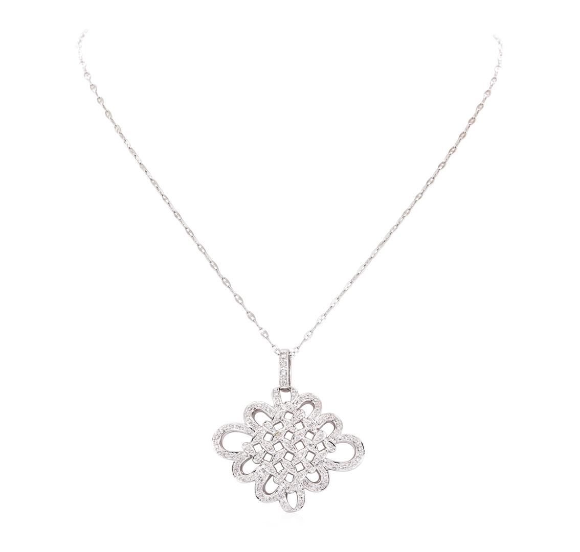 One electronically tested 14-18KT white gold lady's combination cast & assembled fashion pendant & chain 16.0' long, 1.75 Gucci link with a lobster claw clasp with a bright polish finish. The featured lady's pendant has a woven crosshatch motif with scalloped borders measuring 40 millimeters in length. The attached chain is 14 karat white gold. Identified with markings of '585 / 18K 750'. Condition is new, good workmanship. Containing: Eighty prong set round brilliant cut diamonds, measuring 1.50 - 1.30 x 0.87mm (depth est.) approximate total weight of 80 Stones = 0.85ct. Graded in the setting. Color H - I, Clarity SI-1 to I-1, Cut Good. Total Weight of Diamonds 0.85ct. Total Weight of Pendant & Chain 13.10gm. GAS Appraised.