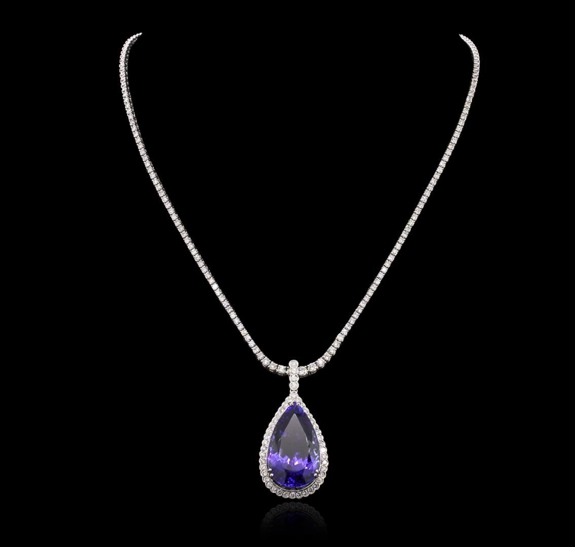 One electronically tested 14KT and 18KT white gold ladies cast & assembled tanzanite and diamond pendant with chain. The 14KT white gold pendant features a tanzanite set within a diamond bezel, completed by a diamond set bail. The pendant is supported by a seventeen inch length 18KT white gold diamond ribbon transitioning into matching white gold links, terminating in a concealed clasp with safety. Bright polish finish with milgrain detailing. Identified with markings of "585 18K". Condition is new, good workmanship. Containing: One prong set pear modified brilliant cut natural tanzanite, measuring 26.23 x 15.75 x 12.42mm, exact weight 36.63ct., clarity is eye clean, type I, dark, moderately strong, violet color, (GIA V 7/4), cut is good. Transmitting light with no distortion, transparent. GIA Gemological Report attached. Graded loose prior to setting in the GIA Laboratory, Report #1166000156.Tanzanite is a very rare gemstone that is only found in the country of Tanzania. Originally discovered in 1967. Tiffany & Company, named the stone Tanzanite. It is found in the Usumburu Mountains that border the Umba Valley of northern Tanzania. Tanzanite occurs in gray, brown, violet, blue, reddish-purple, & green. The gem is interesting because of its exceptional pleochroism. Rotated in different directions a tanzanite will exhibit multiple changes of color. Tanzanite has a low tolerance to ultrasonic cleaning, and should not be cleaned using this method. Forty-Four half bezel set round brilliant cut diamonds, measuring 1.90 - 1.80 x 1.11mm (depth est.) approximate total weight of 44 Stones = 1.11ct. Graded in the setting. Clarity: I-1 to I-2. Color: G - I Nine prong set round brilliant cut diamonds, measuring 3.00 - 2.10 x 1.53mm (depth est.) approximate total weight of 9 Stones = 0.55ct. Graded in the setting. Clarity: SI-1 to SI-2. Color: H - J Ninety-Two prong set round brilliant cut diamonds, measuring 1.80 - 1.60 x 1.02mm (depth est.) approximate total weight of 92 Stones = 1.74ct. Graded in the setting. Clarity: SI-1 to SI-2. Color: H - J. Total Weight of Colored Stones 36.63ct. Total Weight of Diamonds 3.40ct. Total Weight of Pendant With Chain 27.55 grams. AIG Appraised.