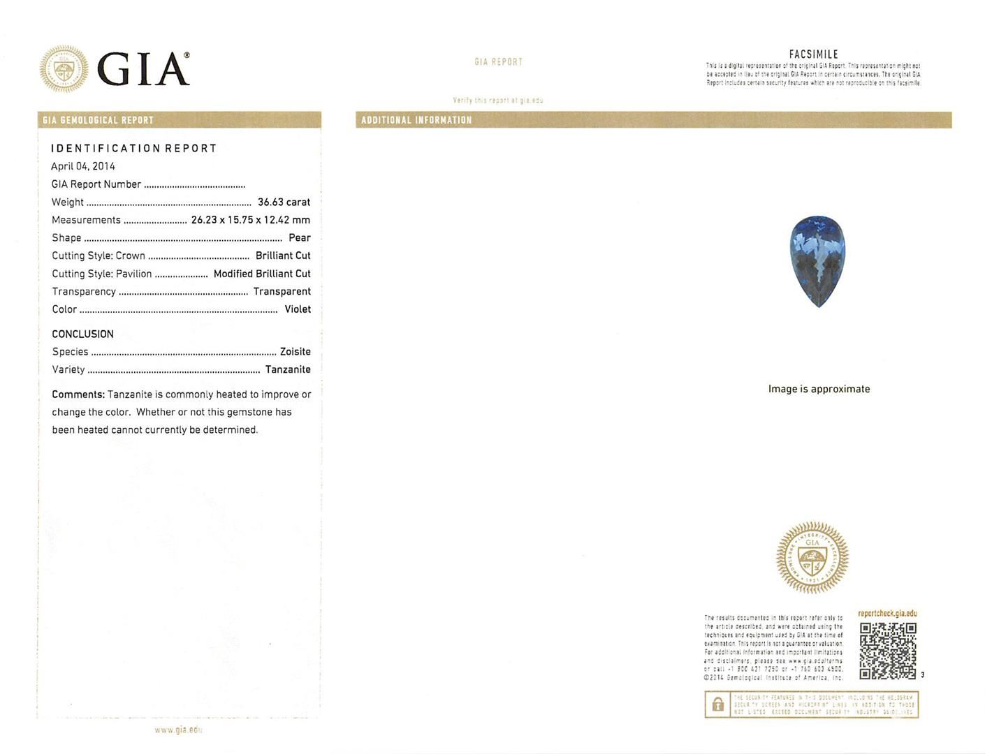 One electronically tested 14KT and 18KT white gold ladies cast & assembled tanzanite and diamond pendant with chain. The 14KT white gold pendant features a tanzanite set within a diamond bezel, completed by a diamond set bail. The pendant is supported by a seventeen inch length 18KT white gold diamond ribbon transitioning into matching white gold links, terminating in a concealed clasp with safety. Bright polish finish with milgrain detailing. Identified with markings of "585 18K". Condition is new, good workmanship. Containing: One prong set pear modified brilliant cut natural tanzanite, measuring 26.23 x 15.75 x 12.42mm, exact weight 36.63ct., clarity is eye clean, type I, dark, moderately strong, violet color, (GIA V 7/4), cut is good. Transmitting light with no distortion, transparent. GIA Gemological Report attached. Graded loose prior to setting in the GIA Laboratory, Report #1166000156.Tanzanite is a very rare gemstone that is only found in the country of Tanzania. Originally discovered in 1967. Tiffany & Company, named the stone Tanzanite. It is found in the Usumburu Mountains that border the Umba Valley of northern Tanzania. Tanzanite occurs in gray, brown, violet, blue, reddish-purple, & green. The gem is interesting because of its exceptional pleochroism. Rotated in different directions a tanzanite will exhibit multiple changes of color. Tanzanite has a low tolerance to ultrasonic cleaning, and should not be cleaned using this method. Forty-Four half bezel set round brilliant cut diamonds, measuring 1.90 - 1.80 x 1.11mm (depth est.) approximate total weight of 44 Stones = 1.11ct. Graded in the setting. Clarity: I-1 to I-2. Color: G - I Nine prong set round brilliant cut diamonds, measuring 3.00 - 2.10 x 1.53mm (depth est.) approximate total weight of 9 Stones = 0.55ct. Graded in the setting. Clarity: SI-1 to SI-2. Color: H - J Ninety-Two prong set round brilliant cut diamonds, measuring 1.80 - 1.60 x 1.02mm (depth est.) approximate total weight of 92 Stones = 1.74ct. Graded in the setting. Clarity: SI-1 to SI-2. Color: H - J. Total Weight of Colored Stones 36.63ct. Total Weight of Diamonds 3.40ct. Total Weight of Pendant With Chain 27.55 grams. AIG Appraised.