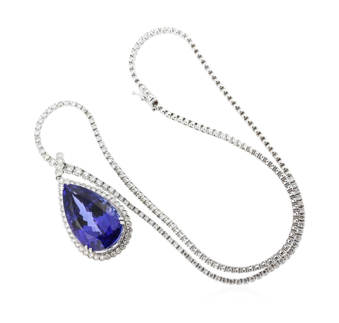 One electronically tested 14KT and 18KT white gold ladies cast & assembled tanzanite and diamond pendant with chain. The 14KT white gold pendant features a tanzanite set within a diamond bezel, completed by a diamond set bail. The pendant is supported by a seventeen inch length 18KT white gold diamond ribbon transitioning into matching white gold links, terminating in a concealed clasp with safety. Bright polish finish with milgrain detailing. Identified with markings of "585 18K". Condition is new, good workmanship. Containing: One prong set pear modified brilliant cut natural tanzanite, measuring 26.23 x 15.75 x 12.42mm, exact weight 36.63ct., clarity is eye clean, type I, dark, moderately strong, violet color, (GIA V 7/4), cut is good. Transmitting light with no distortion, transparent. GIA Gemological Report attached. Graded loose prior to setting in the GIA Laboratory, Report #1166000156.Tanzanite is a very rare gemstone that is only found in the country of Tanzania. Originally discovered in 1967. Tiffany & Company, named the stone Tanzanite. It is found in the Usumburu Mountains that border the Umba Valley of northern Tanzania. Tanzanite occurs in gray, brown, violet, blue, reddish-purple, & green. The gem is interesting because of its exceptional pleochroism. Rotated in different directions a tanzanite will exhibit multiple changes of color. Tanzanite has a low tolerance to ultrasonic cleaning, and should not be cleaned using this method. Forty-Four half bezel set round brilliant cut diamonds, measuring 1.90 - 1.80 x 1.11mm (depth est.) approximate total weight of 44 Stones = 1.11ct. Graded in the setting. Clarity: I-1 to I-2. Color: G - I Nine prong set round brilliant cut diamonds, measuring 3.00 - 2.10 x 1.53mm (depth est.) approximate total weight of 9 Stones = 0.55ct. Graded in the setting. Clarity: SI-1 to SI-2. Color: H - J Ninety-Two prong set round brilliant cut diamonds, measuring 1.80 - 1.60 x 1.02mm (depth est.) approximate total weight of 92 Stones = 1.74ct. Graded in the setting. Clarity: SI-1 to SI-2. Color: H - J. Total Weight of Colored Stones 36.63ct. Total Weight of Diamonds 3.40ct. Total Weight of Pendant With Chain 27.55 grams. AIG Appraised at $106,230.00.