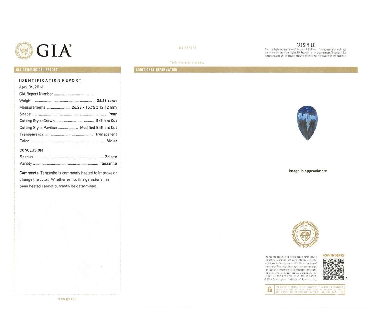 One electronically tested 14KT and 18KT white gold ladies cast & assembled tanzanite and diamond pendant with chain. The 14KT white gold pendant features a tanzanite set within a diamond bezel, completed by a diamond set bail. The pendant is supported by a seventeen inch length 18KT white gold diamond ribbon transitioning into matching white gold links, terminating in a concealed clasp with safety. Bright polish finish with milgrain detailing. Identified with markings of "585 18K". Condition is new, good workmanship. Containing: One prong set pear modified brilliant cut natural tanzanite, measuring 26.23 x 15.75 x 12.42mm, exact weight 36.63ct., clarity is eye clean, type I, dark, moderately strong, violet color, (GIA V 7/4), cut is good. Transmitting light with no distortion, transparent. GIA Gemological Report attached. Graded loose prior to setting in the GIA Laboratory, Report #1166000156.Tanzanite is a very rare gemstone that is only found in the country of Tanzania. Originally discovered in 1967. Tiffany & Company, named the stone Tanzanite. It is found in the Usumburu Mountains that border the Umba Valley of northern Tanzania. Tanzanite occurs in gray, brown, violet, blue, reddish-purple, & green. The gem is interesting because of its exceptional pleochroism. Rotated in different directions a tanzanite will exhibit multiple changes of color. Tanzanite has a low tolerance to ultrasonic cleaning, and should not be cleaned using this method. Forty-Four half bezel set round brilliant cut diamonds, measuring 1.90 - 1.80 x 1.11mm (depth est.) approximate total weight of 44 Stones = 1.11ct. Graded in the setting. Clarity: I-1 to I-2. Color: G - I Nine prong set round brilliant cut diamonds, measuring 3.00 - 2.10 x 1.53mm (depth est.) approximate total weight of 9 Stones = 0.55ct. Graded in the setting. Clarity: SI-1 to SI-2. Color: H - J Ninety-Two prong set round brilliant cut diamonds, measuring 1.80 - 1.60 x 1.02mm (depth est.) approximate total weight of 92 Stones = 1.74ct. Graded in the setting. Clarity: SI-1 to SI-2. Color: H - J. Total Weight of Colored Stones 36.63ct. Total Weight of Diamonds 3.40ct. Total Weight of Pendant With Chain 27.55 grams. AIG Appraised.