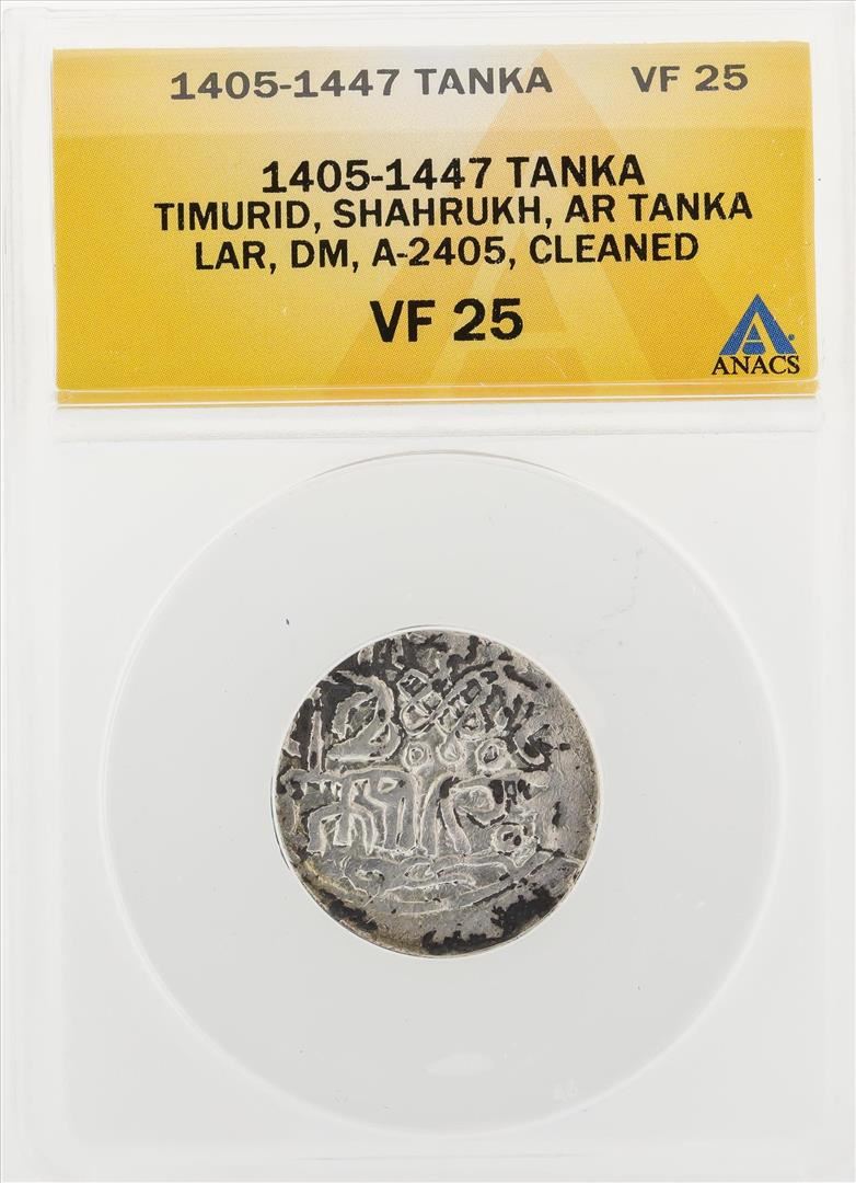 One 1405-1447 Tanka Timurid Shahrukh AR Tanka Lar DM A2405 Cleaned Coin ANACS VF25. ANACS Certified.
