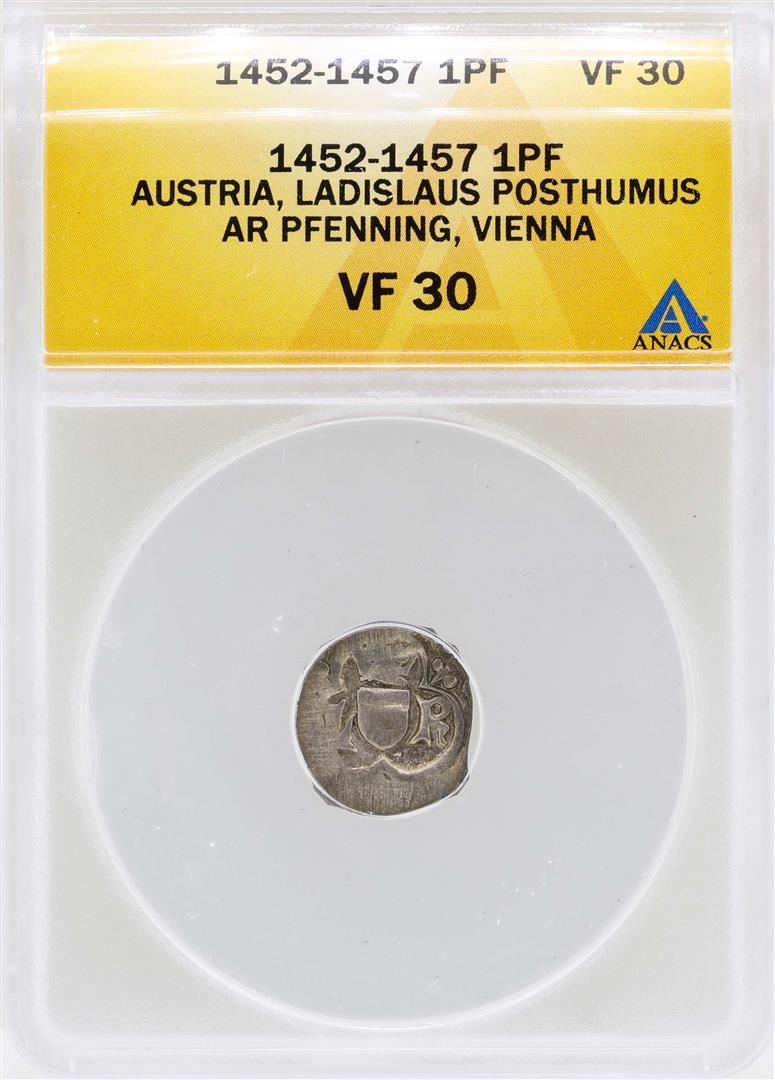 One 1452-1457 Austrai Pfenning Lasislaus Posthumus Coin ANACS VF30. ANACS Certified.
