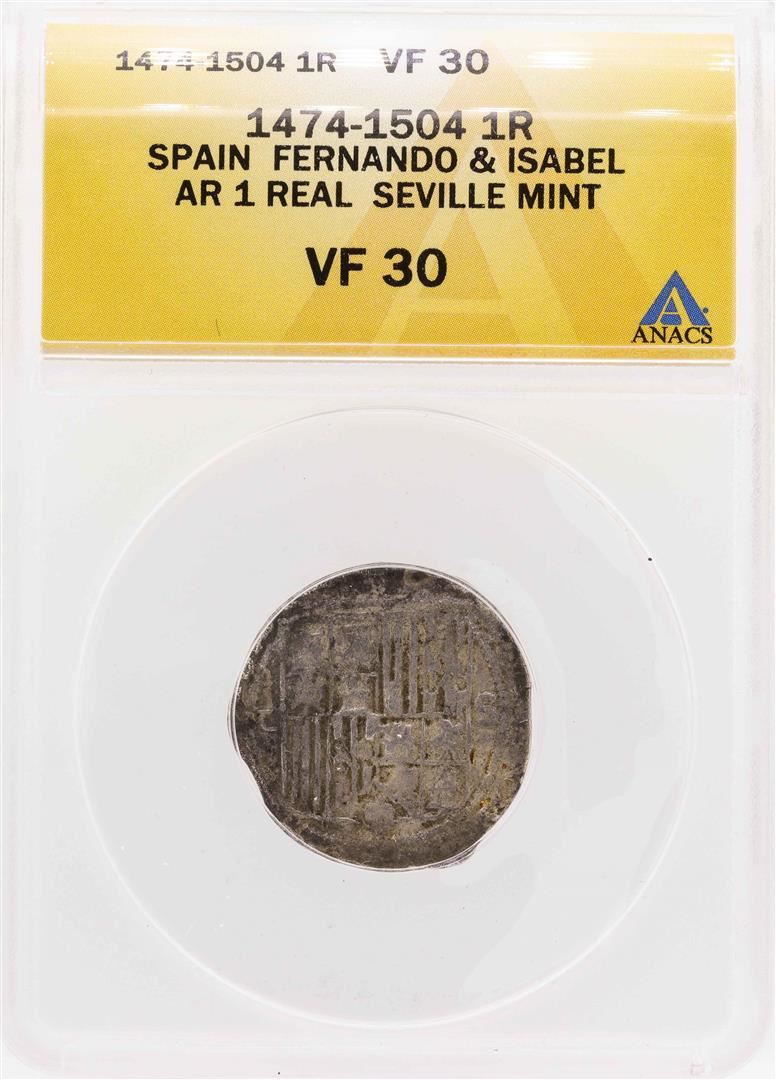 One 1474-1504 Spain Fernando & Isabel AR Real Seville Mint Coin ANACS VF30. ANACS Certified.