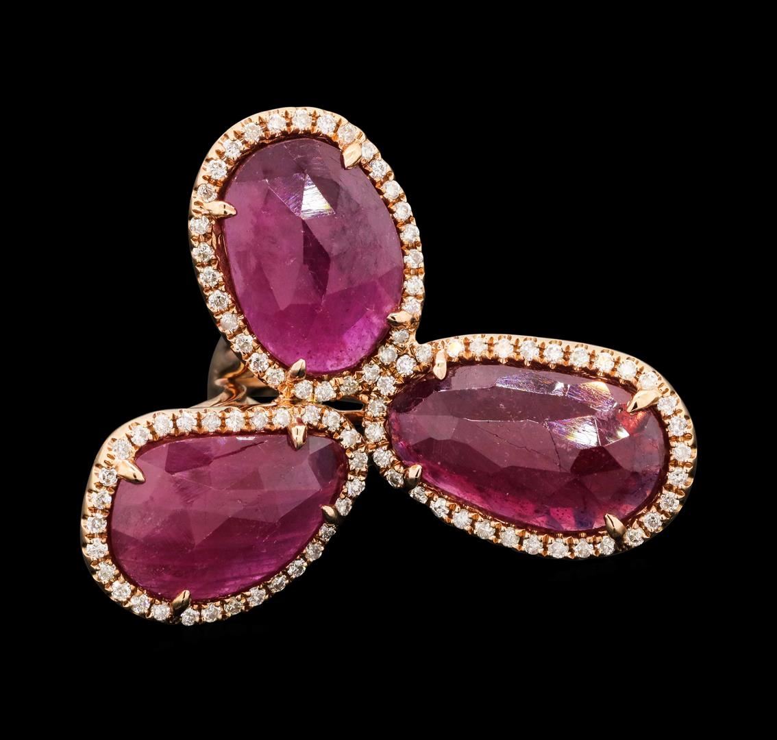 One electronically tested 14KT rose gold lady's cast fashion ring with a split shank with a bright polish finish. The featured lady's ring has three individual ruby and diamond halo sections and a shank measuring 2.35 millimeters wide. Identified with markings of "14K 585". Condition is new, good workmanship. Containing: Three prong set briolettes cabochon cut natural rubies, measuring 12.80 x 8.45 x 3.00mm, (depth est.) approximate total weight of 7.97ct., clarity is severely included, medium, moderately strong, slightly purplish red color, (GIA slpR 5/4), cut is good. Transmitting light diffusely, opaque to translucent. Naturally occurring internal & external characteristics are present. Indications of laboratory high temperature heat treatment, with glass & flux additives. Colored gemstones are presumed to have been subjected to commonly used enhancement processes. Graded in the setting. Ninety-Two prong set round brilliant cut diamonds, measuring 1.00 - 0.95 x 0.61mm (depth est.) approximate total weight of 92 Stones = 0.32ct. Graded in the setting. Color H - I Clarity SI-2 to I-1 Cut Good. Total Weight of Colored Stones 7.97ct. Total Weight of Diamonds 0.32ct. Total Weight of Ring 7.80gm. GAS Appraised.