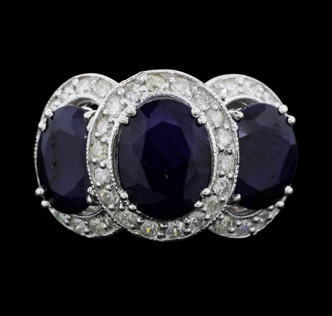 14KT white gold, sapphire and diamond ring holding three oval cut sapphire corundum gemstones which are prong mounted in the center of the ring. Oval faceted cut sapphires weight 10.08 carats with a clarity of SI, Type 3 are each surrounded by round, brilliant cut diamonds totaling 1.16 carats with an I1 clarity and H-J average color. Overall gross weight of this ring is 10.3 grams. GGA Appraised.