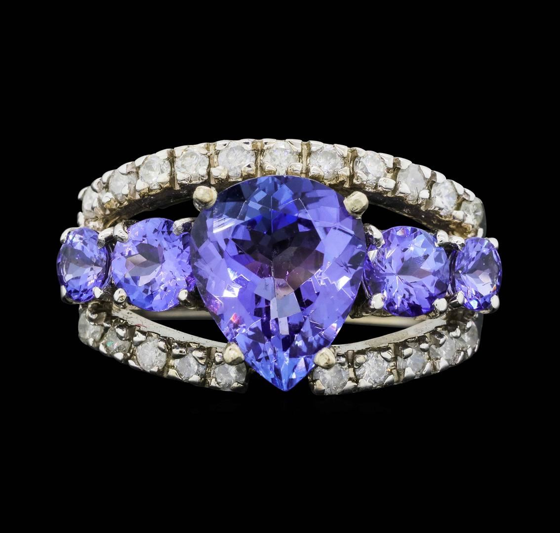 Electronically tested, stamped and polished 14 KT white gold ring mounted with 5 genuine tanzanite stones weighing in at 4.15 ct., one pear shaped and the remaining 4 round, all faceted. Surrounded by 21, round brilliant diamonds with a carat weight of 0.58, clarity of S13-I2 and a color grade of I-K. Weight totaling 8.8 grams in like new condition and excellent workmanship. GLA Appraised.