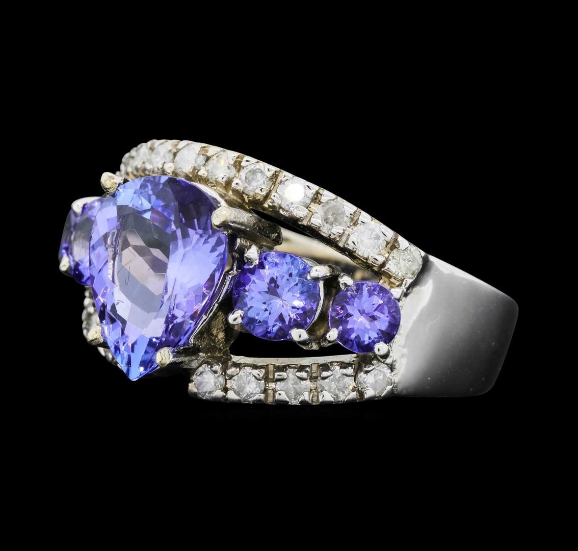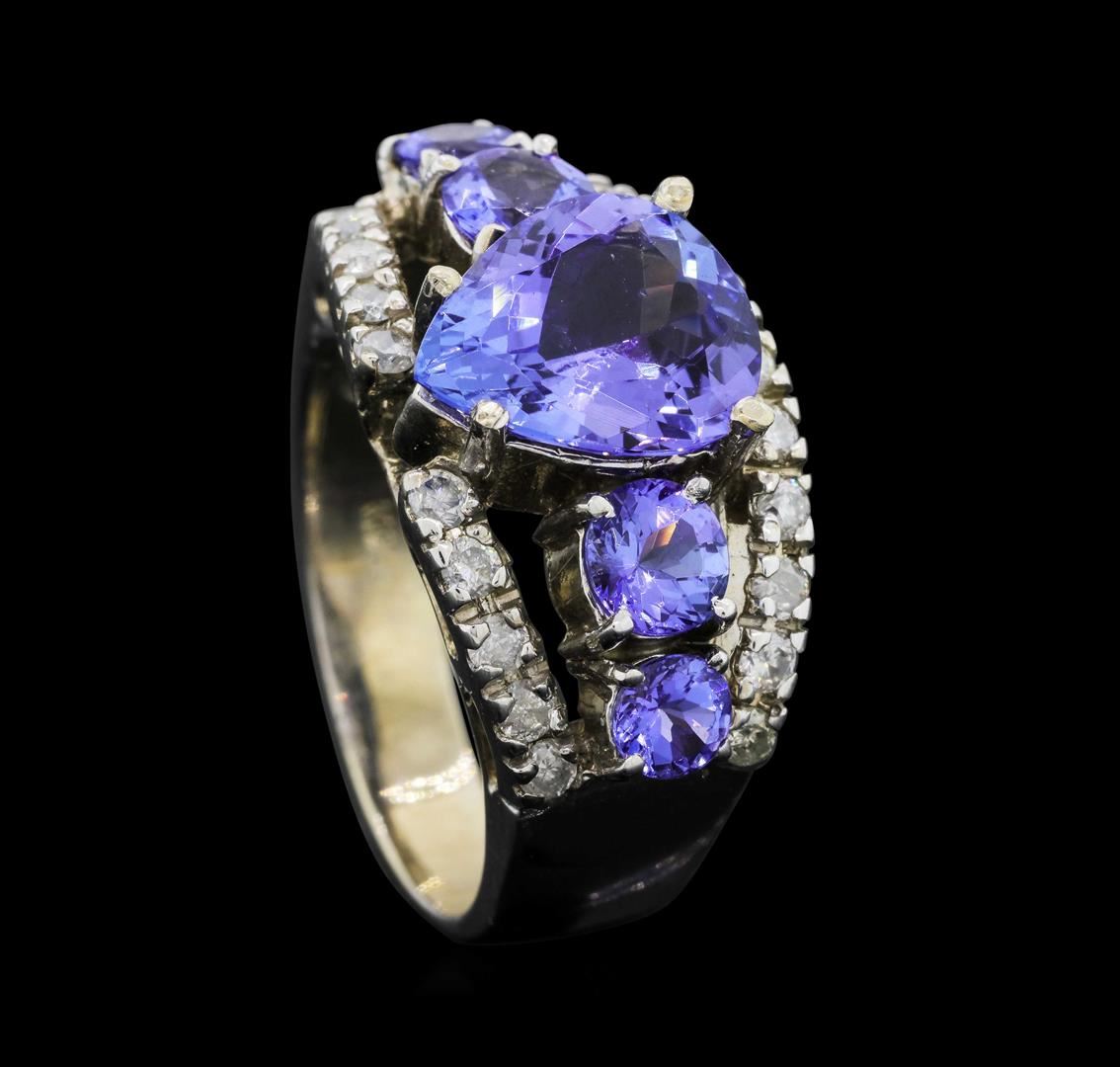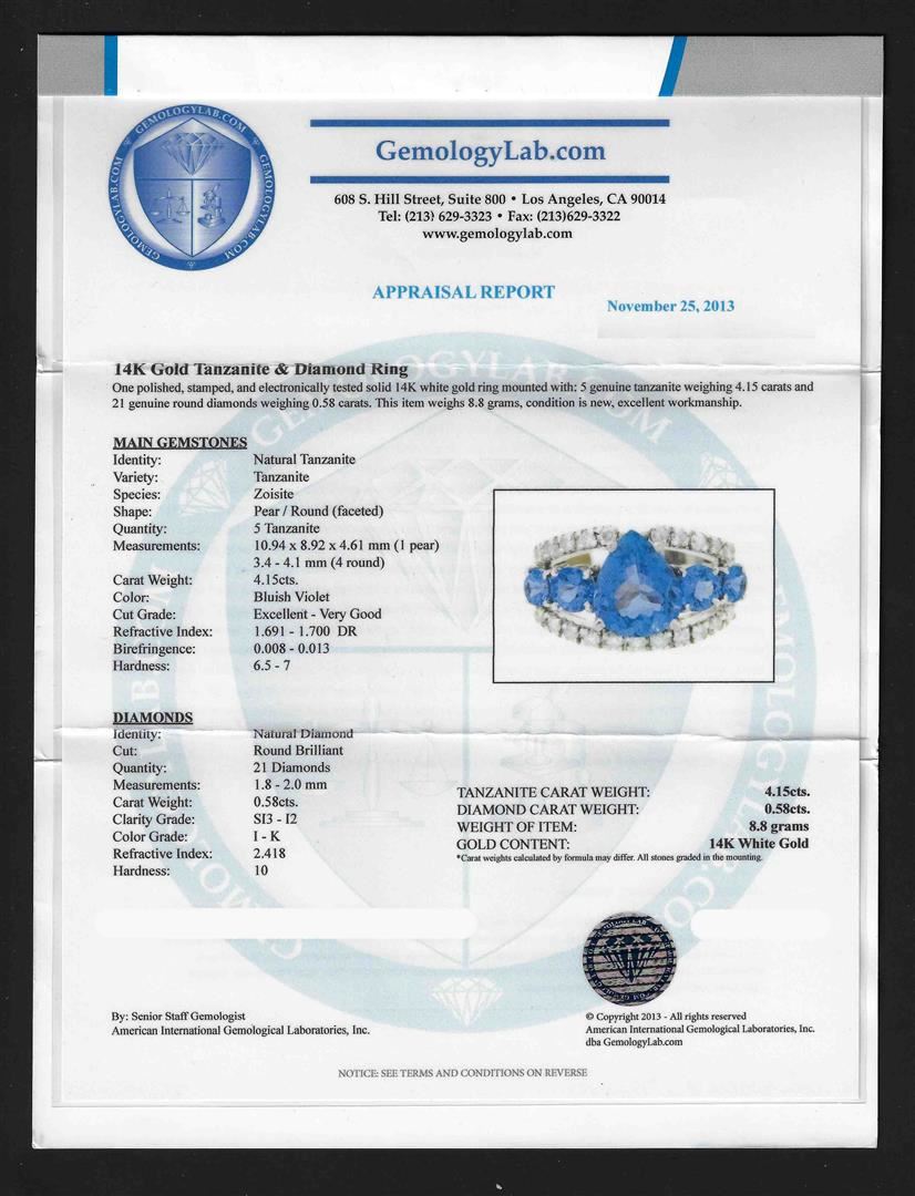 Electronically tested, stamped and polished 14 KT white gold ring mounted with 5 genuine tanzanite stones weighing in at 4.15 ct., one pear shaped and the remaining 4 round, all faceted. Surrounded by 21, round brilliant diamonds with a carat weight of 0.58, clarity of S13-I2 and a color grade of I-K. Weight totaling 8.8 grams in like new condition and excellent workmanship. GLA Appraised.