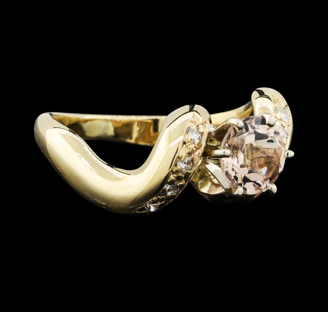 One 14K Yellow Gold 0.80ct Morganite and Diamond Ring containing (1) Prong Set approximately 0.80ct Round Cut Morganite, and (8) Round Cut Diamonds weighing approximately 0.15ctw. The total weight of the ring is 4.4 grams.