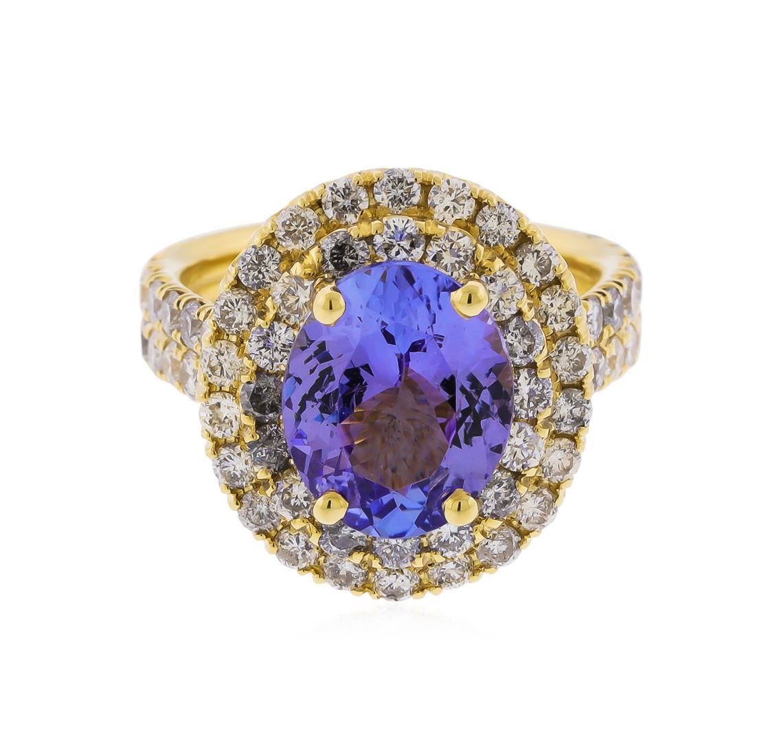 14K Yellow Gold 3.59ct Tanzanite and Diamond Ring. This ring contains (1) 3.59ct Tanzanite and approximately 2.29ctws of Round Brilliant Cut Diamonds. The total weight of the ring is 7.7 grams.