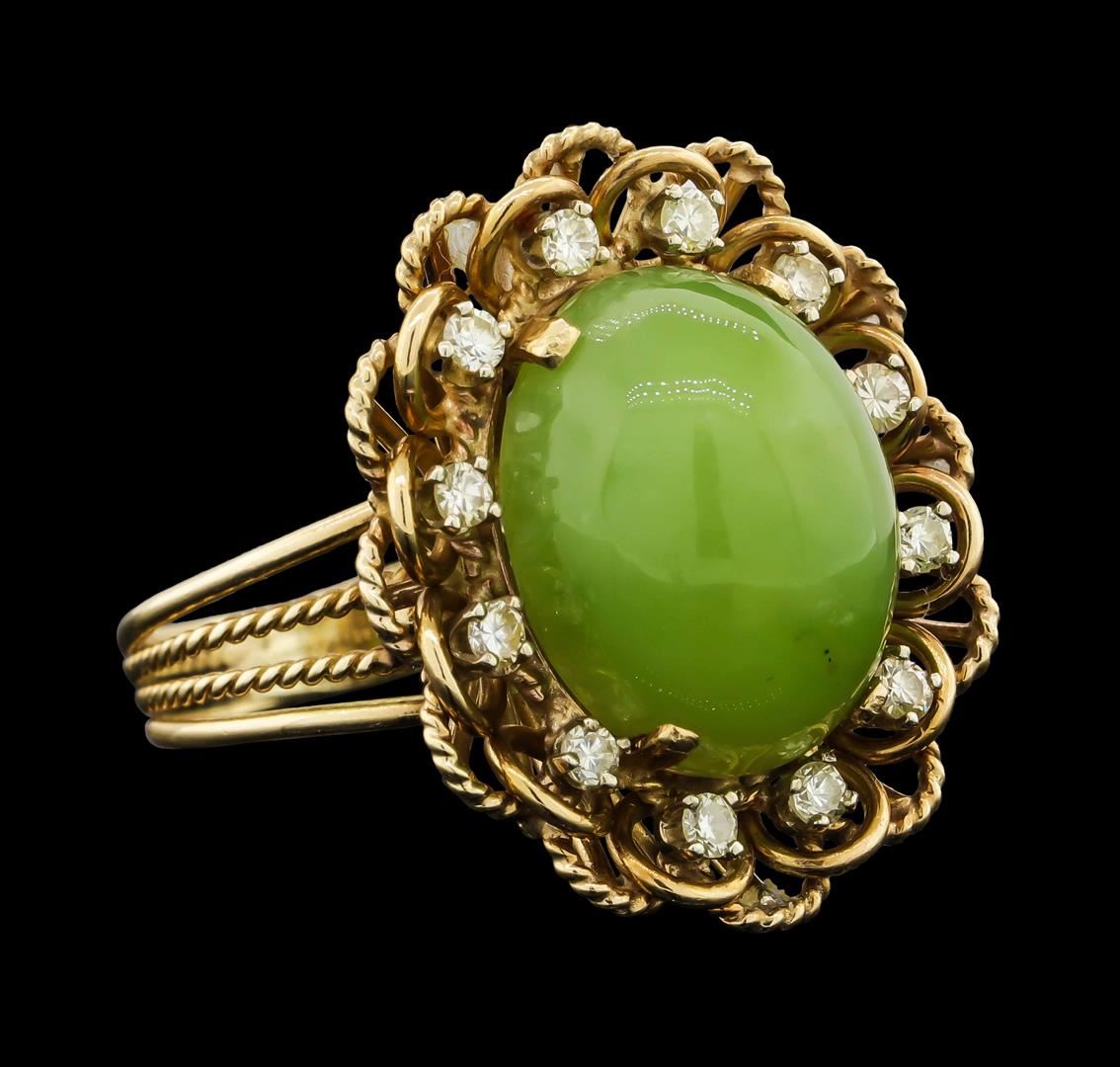 One 14K Yellow Gold Jade and Diamond Ring. The ring contains (1) Jade center stone, and (12) Brilliant Round Cut Diamonds weighing approximately 0.24ctw. The total weight of the ring is 8.8 grams.